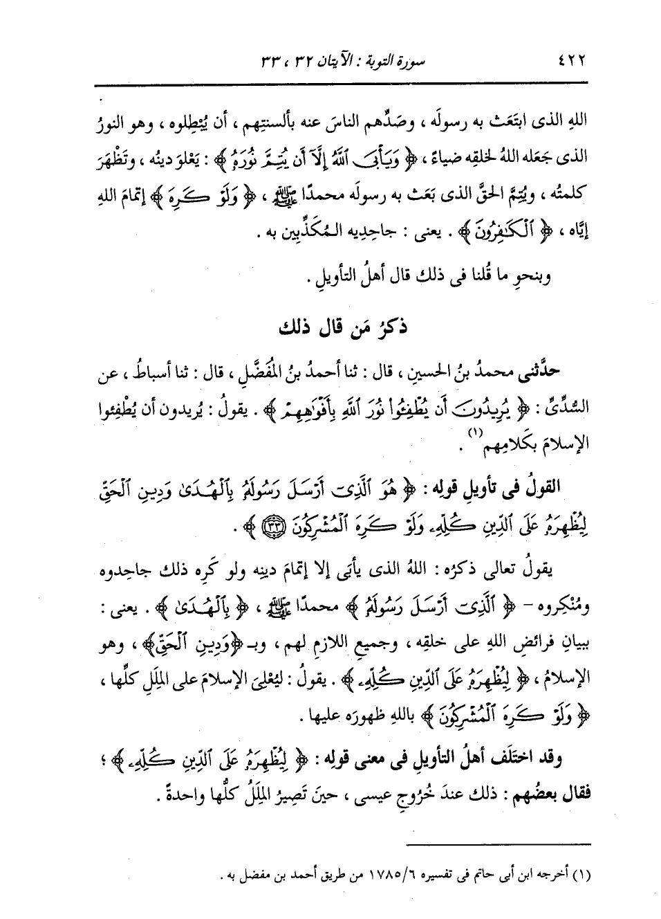 §الْقَوْلُ فِي تَأْوِيلِ قَوْلِهِ تَعَالَى: {هُوَ الَّذِي أَرْسَلَ رَسُولَهُ بِالْهُدَى وَدِينِ الْحَقِّ لِيُظْهِرَهُ عَلَى الدِّينِ كُلِّهِ وَلَوْ كَرِهَ الْمُشْرِكُونَ} [التوبة: 33] يَقُولُ تَعَالَى ذِكْرُهُ: اللَّهُ الَّذِي يَأْبَى إِلَّا إِتْمَامَ دِينِهِ وَلَوْ كَرِهَ ذَلِكَ جَاحِدُوهُ وَمُنْكِرُوهُ، الَّذِي أَرْسَلَ رَسُولَهُ مُحَمَّدًا صَلَّى اللهُ عَلَيْهِ وَسَلَّمَ بِالْهُدَى، يَعْنِي: بِبَيَانِ فَرَائِضِ اللَّهِ عَلَى خَلْقِهِ، وَجَمِيعِ اللَّازِمِ لَهُمْ، وَبِدِينِ الْحَقِّ وَهُوَ الْإِسْلَامُ {لِيُظْهِرَهُ عَلَى الدِّينِ كُلِّهِ} [التوبة: 33] يَقُولُ: لِيُعْلِيَ الْإِسْلَامَ عَلَى الْمِلَلِ كُلِّهَا. {وَلَوْ كَرِهَ الْمُشْرِكُونَ} [التوبة: 33] بِاللَّهِ ظُهُورَهُ عَلَيْهَا. وَقَدِ اخْتَلَفَ أَهْلُ التَّأْوِيلِ فِي مَعْنَى قَوْلِهِ: {لِيُظْهِرَهُ عَلَى الدِّينِ كُلِّهِ} [التوبة: 33] فَقَالَ بَعْضُهُمْ: ذَلِكَ عِنْدَ خُرُوجِ عِيسَى حِينَ تَصِيرُ الْمِلَلُ كُلُّهَا وَاحِدَةً