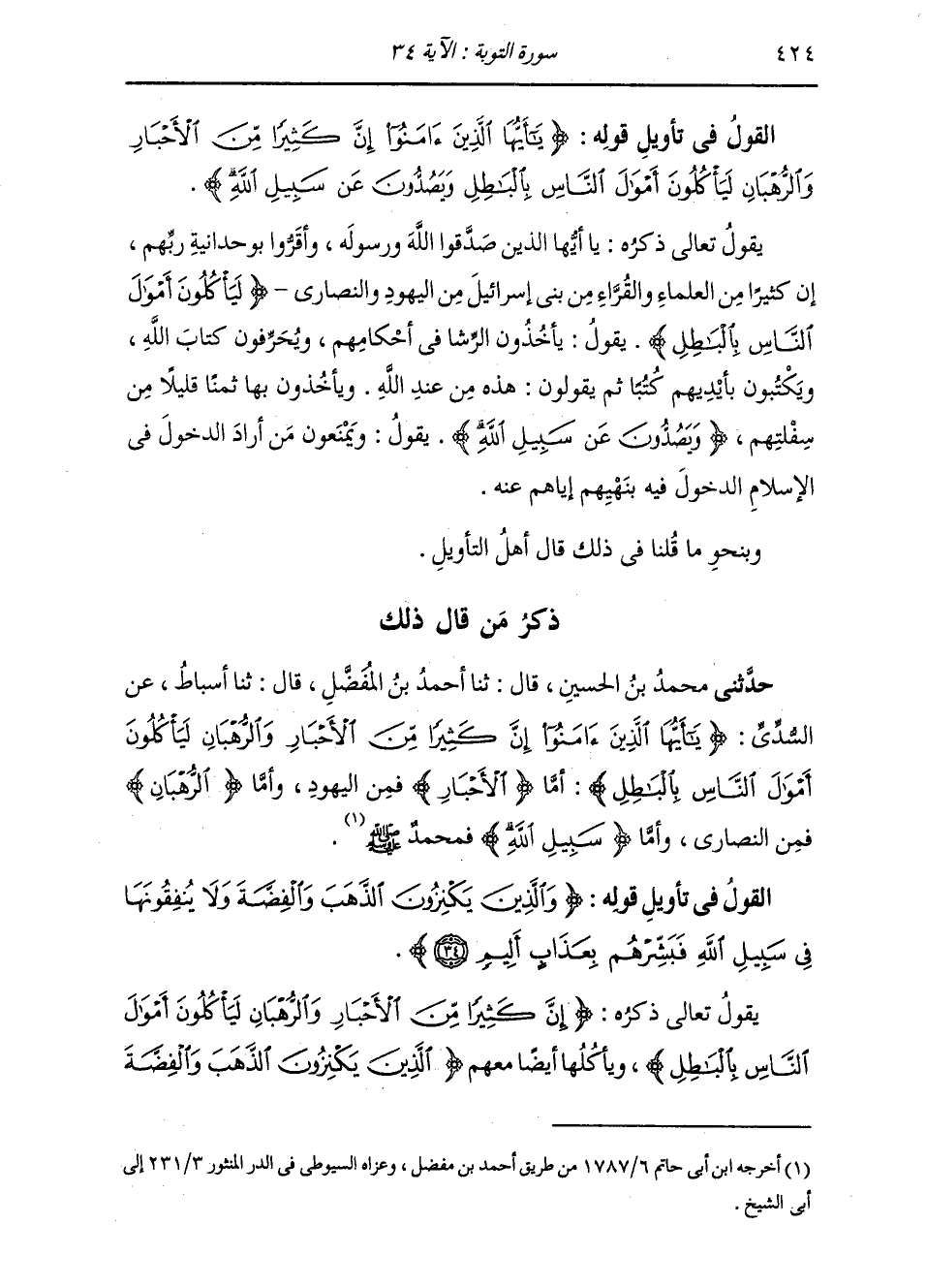 ذِكْرُ مَنْ قَالَ ذَلِكَ: حَدَّثَنِي مُحَمَّدُ بْنُ الْحُسَيْنِ، قَالَ: ثنا أَحْمَدُ بْنُ الْمُفَضَّلِ، قَالَ: ثنا أَسْبَاطٌ، عَنِ السُّدِّيِّ: " {يَا أَيُّهَا الَّذِينَ آمَنُوا §إِنَّ كَثِيرًا مِنَ الْأَحْبَارِ وَالرُّهْبَانِ لَيَأْكُلُونَ أَمْوَالَ النَّاسِ بِالْبَاطِلِ} [التوبة: 34] أَمَا الْأَحْبَارُ، فَمِنَ الْيَهُودِ، وَأَمَّا الرُّهْبَانُ: فَمِنَ النَّصَارَى، وَأَمَّا سَبِيلُ اللَّهِ: فَمُحَمَّدٌ صَلَّى اللهُ عَلَيْهِ وَسَلَّمَ "