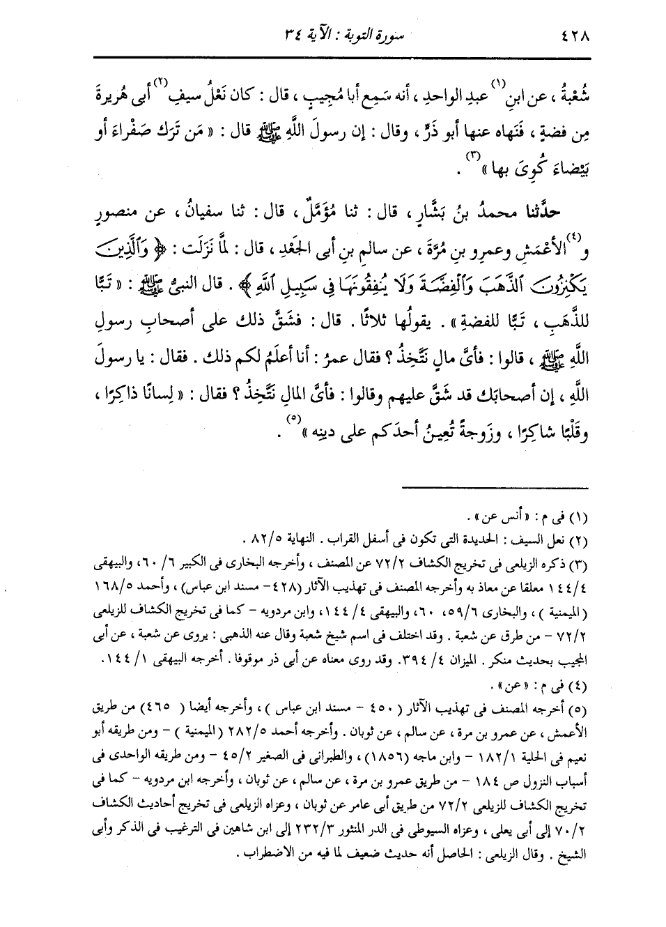 حَدَّثَنَا مُحَمَّدُ بْنُ بَشَّارٍ، قَالَ: ثنا مُؤَمَّلٌ، قَالَ: ثنا سُفْيَانُ، عَنْ مَنْصُورٍ، عَنِ الْأَعْمَشِ، وَعَمْرِو بْنِ مُرَّةَ، عَنْ سَالِمِ بْنِ أَبِي الْجَعْدِ، قَالَ: لَمَّا نَزَلَتْ: {§وَالَّذِينَ يَكْنِزُونَ الذَّهَبَ وَالْفِضَّةَ وَلَا يُنْفِقُونَهَا فِي سَبِيلِ اللَّهِ} [التوبة: 34] قَالَ النَّبِيُّ صَلَّى اللهُ عَلَيْهِ وَسَلَّمَ: «تَبًّا لِلذَّهَبِ تَبًّا لِلْفِضَّةِ» يَقُولُهَا ثَلَاثًا. قَالَ: فَشَقَّ ذَلِكَ عَلَى أَصْحَابِ رَسُولِ اللَّهِ صَلَّى اللهُ عَلَيْهِ وَسَلَّمَ، قَالُوا: فَأَيُّ مَالٍ نَتَّخِذُهُ؟ فَقَالَ عُمَرُ: أَنَا أَعْلَمُ لَكُمْ ذَلِكَ. فَقَالَ: يَا رَسُولَ اللَّهِ إِنَّ أَصْحَابَكَ قَدْ شَقَّ عَلَيْهِمْ وَقَالُوا: فَأَيُّ الْمَالِ نَتَّخِذُ، فَقَالَ: «لِسَانًا ذَاكِرًا، وَقَلْبًا شَاكِرًا، وَزَوْجَةً تُعِينُ أَحَدَكُمْ عَلَى دِينِهِ» -[429]- حَدَّثَنَا ابْنُ بَشَّارٍ، قَالَ: ثنا مُؤَمَّلٌ، قَالَ: ثنا إِسْرَائِيلُ، عَنْ مَنْصُورٍ، عَنْ سَالِمِ بْنِ أَبِي الْجَعْدِ، عَنْ ثَوْبَانَ، بِمِثْلِهِ