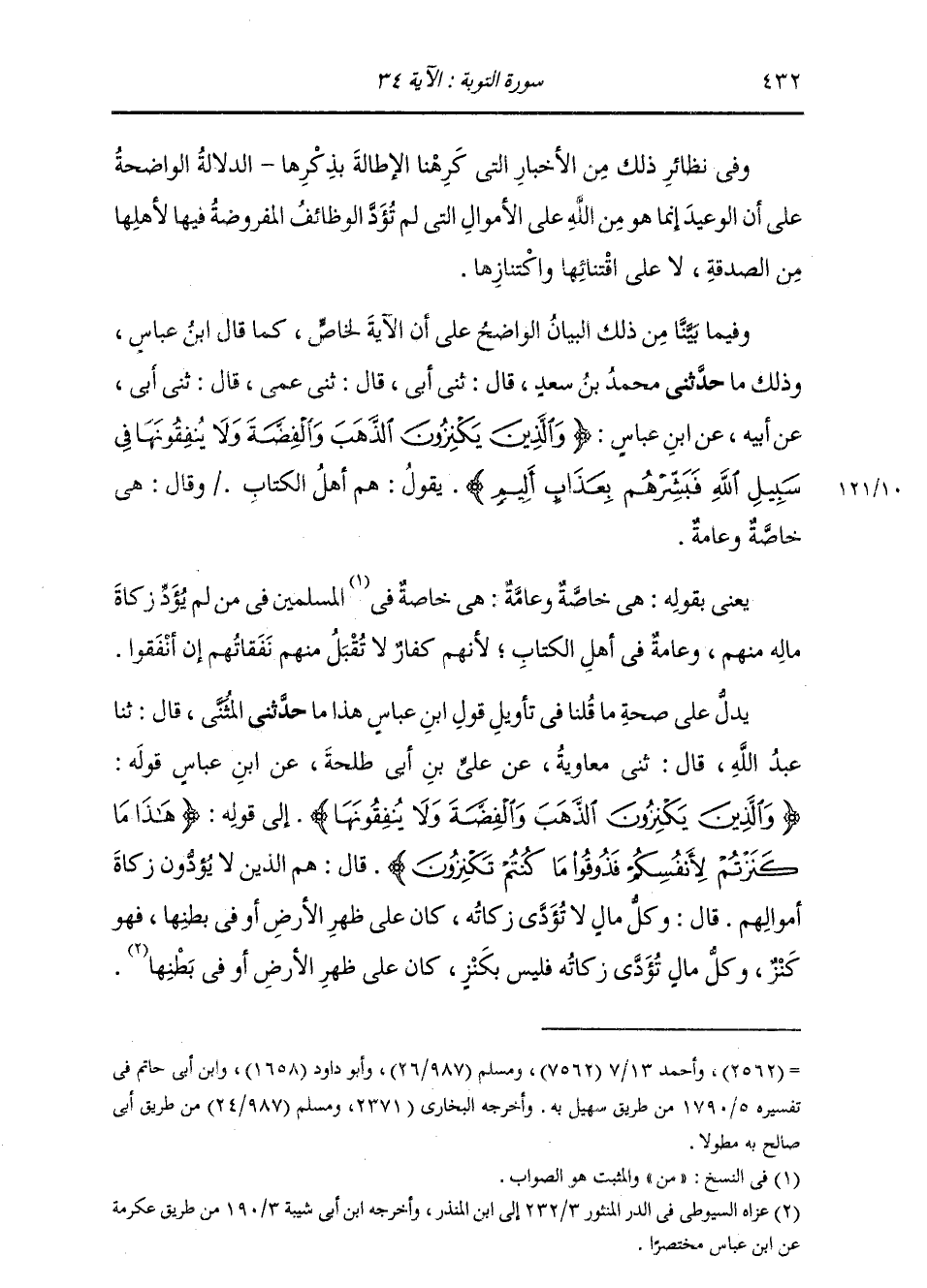 وَذَلِكَ مَا: حَدَّثَنِي مُحَمَّدُ بْنُ سَعْدٍ، قَالَ: ثني أَبِي، قَالَ: ثني عَمِّي، قَالَ ثني أَبِي، عَنْ أَبِيهِ، عَنِ ابْنِ عَبَّاسٍ: " {§وَالَّذِينَ يَكْنِزُونَ الذَّهَبَ وَالْفِضَّةَ وَلَا يُنْفِقُونَهَا فِي سَبِيلِ اللَّهِ فَبَشِّرْهُمْ بِعَذَابٍ أَلِيمٍ} [التوبة: 34] يَقُولُ: هُمْ أَهْلُ الْكِتَابِ، وَقَالَ: هِيَ خَاصَّةٌ وَعَامَّةٌ " يَعْنِي بِقَوْلِهِ: هِيَ خَاصَّةٌ وَعَامَّةٌ، هِيَ خَاصَّةٌ مِنَ الْمُسْلِمِينَ فِيمَنْ لَمْ يُؤَدِّ زَكَاةَ مَالِهِ مِنْهُمْ، وَعَامَّةٌ فِي أَهْلِ الْكِتَابِ؛ لِأَنَّهُمْ كُفَّارٌ لَا تُقْبَلُ مِنْهُمْ نَفَقَاتُهُمْ إِنْ أَنْفَقُوا. يَدُلُّ عَلَى صِحَّةِ مَا قُلْنَا فِي تَأْوِيلِ قَوْلِ ابْنِ عَبَّاسٍ