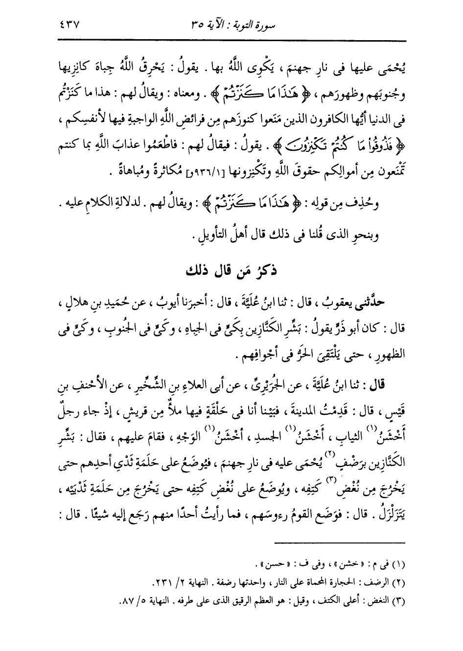 ذِكْرُ مَنْ قَالَ ذَلِكَ: حَدَّثَنِي يَعْقُوبُ، قَالَ: ثنا ابْنُ عُلَيَّةَ، قَالَ: أَخْبَرَنَا أَيُّوبُ، عَنْ حُمَيْدِ بْنِ هِلَالٍ، قَالَ: كَانَ أَبُو ذَرٍّ يَقُولُ: «§بَشِّرِ الْكَنَّازِينَ بِكَيٍّ فِي الْجِبَاهِ وَكَيٍّ فِي الْجُنُوبِ وَكَيٍّ فِي الظُّهُورِ، حَتَّى يَلْتَقِيَ الْحَرُّ فِي أَجْوَافِهِمْ»