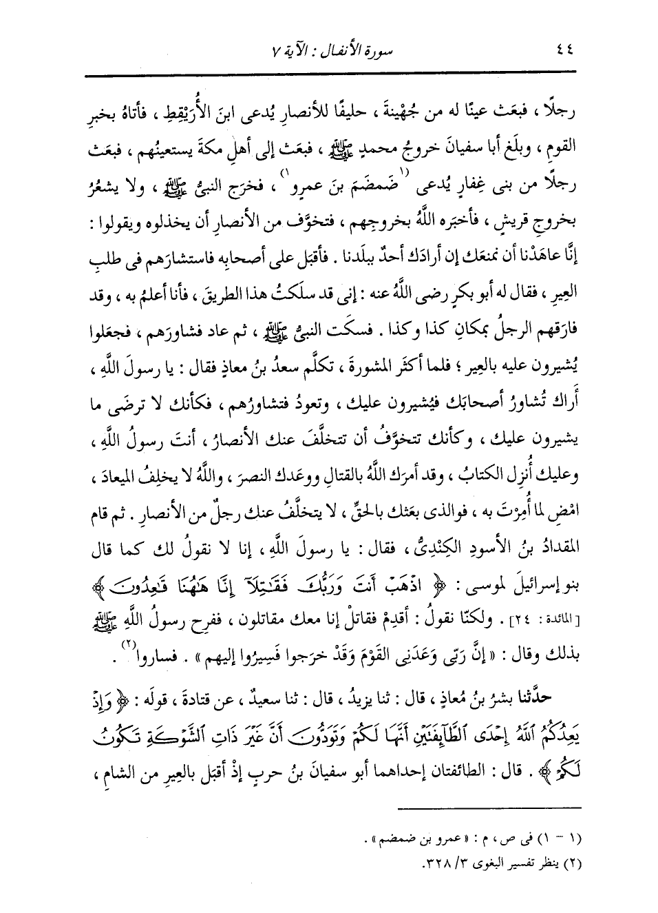 رَجُلًا، فَبَعَثَ عَيْنًا لَهُ مِنْ جُهَيْنَةَ، حَلِيفًا لِلْأَنْصَارِ يُدْعَى ابْنُ الْأُرَيْقِطِ، فَأَتَاهُ بِخَبَرِ الْقَوْمِ. وَبَلَغَ أَبَا سُفْيَانَ خُرُوجُ مُحَمَّدٍ صَلَّى اللهُ عَلَيْهِ وَسَلَّمَ، فَبَعَثَ إِلَى أَهْلِ مَكَّةَ يَسْتَعِينُهُمْ، فَبَعَثَ رَجُلًا مِنْ بَنِي غِفَارٍ يُدْعَى ضَمْضَمَ بْنَ عَمْرٍو، فَخَرَجَ النَّبِيُّ صَلَّى اللهُ عَلَيْهِ وَسَلَّمَ وَلَا يَشْعُرُ بِخُرُوجِ قُرَيْشٍ، فَأَخْبَرَهُ اللَّهُ بِخُرُوجِهِمْ، فَتَخَوَّفَ مِنَ الْأَنْصَارِ أَنْ يَخْذُلُوهُ وَيَقُولُوا: إِنَّا عَاهَدْنَا أَنْ نَمْنَعْكَ إِنْ أَرَادَكَ أَحَدٌ بِبَلَدِنَا. فَأَقْبَلَ عَلَى أَصْحَابِهِ فَاسْتَشَارَهُمْ فِي طَلَبِ الْعِيرِ، فَقَالَ لَهُ أَبُو بَكْرٍ رَضِيَ اللَّهُ عَنْهُ: إِنِّي قَدْ سَلَكْتُ هَذَا الطَّرِيقَ، فَأَنَا أَعْلَمُ بِهِ، وَقَدْ فَارَقَهُمُ الرَّجُلُ بِمَكَانِ كَذَا وَكَذَا، فَسَكَتَ النَّبِيُّ صَلَّى اللهُ عَلَيْهِ وَسَلَّمَ، ثُمَّ عَادَ فَشَاوَرَهُمْ، فَجَعَلُوا يُشِيرُونَ عَلَيْهِ بِالْعِيرِ. فَلَمَّا أَكْثَرَ الْمَشُورَةَ، تَكَلَّمَ سَعْدُ بْنُ مُعَاذٍ فَقَالَ: يَا رَسُولَ اللَّهِ، أَرَاكَ تُشَاوِرُ أَصْحَابَكَ فَيُشِيرُونَ عَلَيْكَ وَتَعُودُ فَتُشَاوِرُهُمْ، فَكَأَنَّكَ لَا تَرْضَى مَا يُشِيرُونَ عَلَيْكَ وَكَأَنَّكَ تَتَخَوَّفُ أَنْ تَتَخَلَّفَ عنكَ الْأَنْصَارُ، أَنْتَ رَسُولُ اللَّهِ، وَعَلَيْكَ أُنْزِلَ الْكِتَابُ، وَقَدْ أَمَرَكَ اللَّهُ بِالْقِتَالِ وَوَعَدَكَ النَّصْرَ، وَاللَّهُ لَا يُخْلِفُ الْمِيعَادَ، امْضِ لِمَا أُمِرْتَ بِهِ، فَوَالَّذِي بَعَثَكَ بِالْحَقِّ لَا يَتَخَلَّفُ عنكَ رَجُلٌ مِنَ الْأَنْصَارِ، ثُمَّ قَامَ الْمِقْدَادُ بْنُ الْأَسْوَدِ الْكِنْدِيُّ، فَقَالَ: يَا رَسُولَ اللَّهِ إِنَّا لَا نَقُولُ لَكَ كَمَا قَالَ بَنُو إِسْرَائِيلَ لِمُوسَى: {§اذْهَبْ أَنْتَ وَرَبُّكَ فَقَاتِلَا إِنَّا هَاهُنَا قَاعِدُونَ} وَلَكِنَّا نَقُولِ: أَقْدِمْ فَقَاتِلْ إِنَّا مَعَكَ مُقَاتِلُونَ، فَفَرِحَ رَسُولُ اللَّهِ صَلَّى اللهُ عَلَيْهِ وَسَلَّمَ بِذَلِكَ وَقَالَ: «إِنَّ رَبِّي وَعَدَنِي الْقَوْمَ وَقَدْ خَرَجُوا فَسِيرُوا إِلَيْهِمْ» فَسَارُوا "