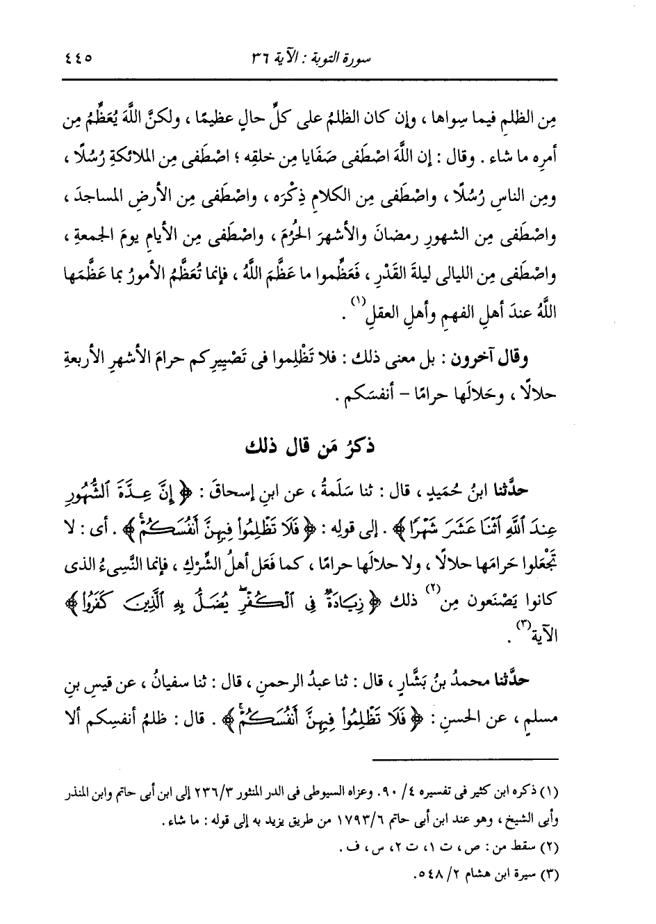 ذِكْرُ مَنْ قَالَ ذَلِكَ: حَدَّثَنَا ابْنُ حُمَيْدٍ، قَالَ: ثنا سَلَمَةُ، عَنِ ابْنِ إِسْحَاقَ: " {§إِنَّ عِدَّةَ الشُّهُورِ عِنْدَ اللَّهِ اثْنَا عَشَرَ شَهْرًا} [التوبة: 36] إِلَى قَوْلِهِ: {فَلَا تَظْلِمُوا فِيهِنَّ أَنْفُسَكُمْ} [التوبة: 36] أَيْ لَا تَجْعَلُوا حَرَامَهَا حَلَالًا، وَلَا حَلَالَهَا حَرَامًا، كَمَا فَعَلَ أَهْلُ الشِّرْكِ، فَإِنَّمَا النَّسِيءُ الَّذِي كَانُوا يَصْنَعُونَ مِنْ ذَلِكَ {زِيَادَةٌ فِي الْكُفْرِ يُضَلُّ بِهِ الَّذِينَ كَفَرُوا} [التوبة: 37] الْآيَةَ "