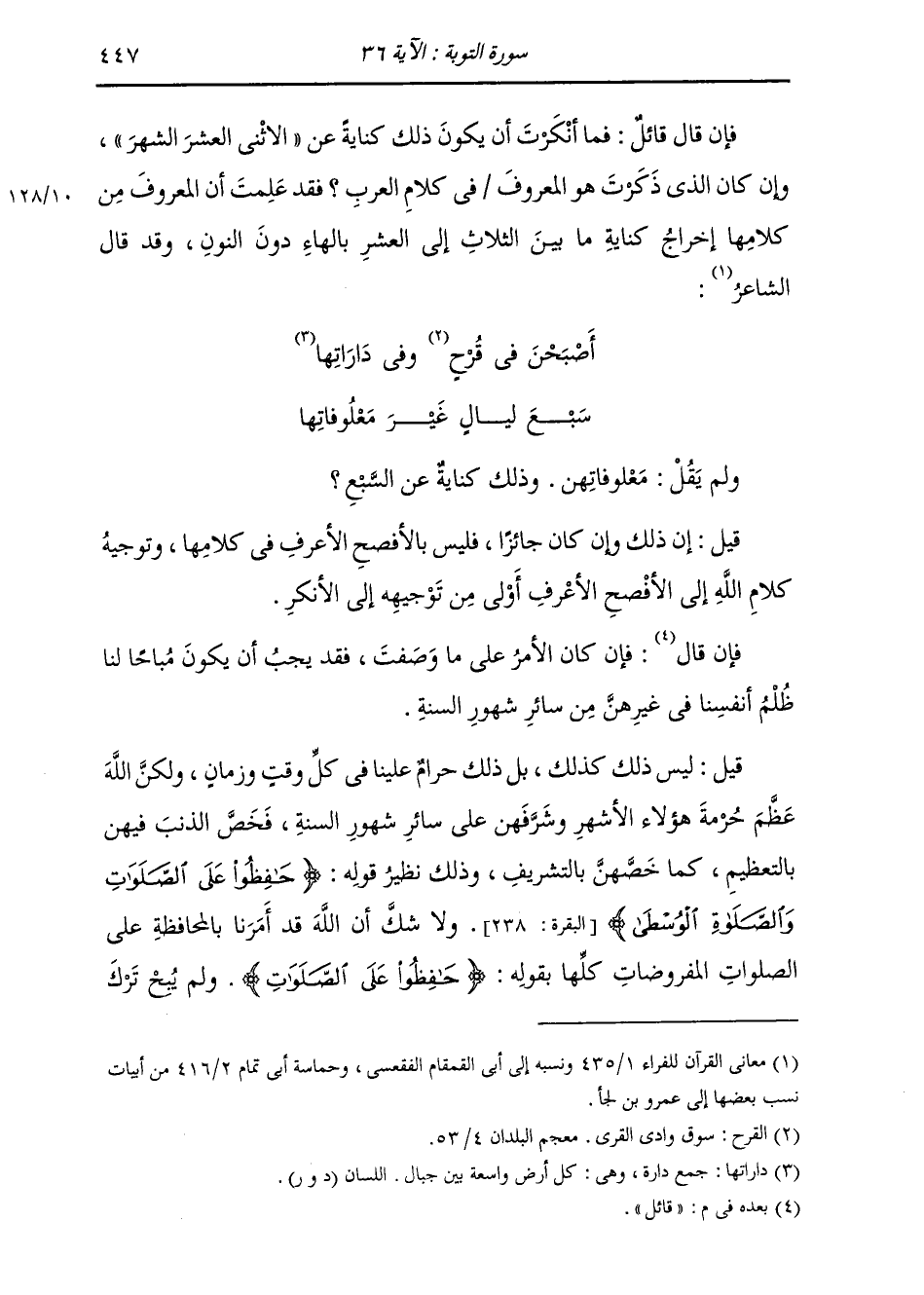 وَلَمْ يَقُلْ: مُعْلُوفَاتِهِنَّ، وَذَلِكَ كِنَايَةٌ عَنِ السَّبْعِ؟ قِيلَ: إِنَّ ذَلِكَ وَإِنْ كَانَ جَائِزًا فَلَيْسَ الْأَصَحَّ الْأَعْرَفَ فِي كَلَامِهَا، وَتَوْجِيهُ كَلَامِ اللَّهِ إِلَى الْأَفْصَحِ الْأَعْرَفِ أَوْلَى مِنْ تَوْجِيهِهِ إِلَى الْأَنْكَرِ. فَإِنْ قَالَ قَائِلٌ: فَإِنْ كَانَ الْأَمْرُ عَلَى مَا وَصَفْتَ، فَقَدْ يَجِبُ أَنْ يَكُونَ مُبَاحًا لَنَا ظُلْمُ أَنْفُسِنَا فِي غَيْرِهِنَّ مِنْ سَائِرِ شُهُورِ السَّنَةِ؟ قِيلَ: لَيْسَ ذَلِكَ كَذَلِكَ، بَلْ ذَلِكَ حَرَامٌ عَلَيْنَا فِي كُلِّ وَقْتٍ وَزَمَانٍ، وَلَكِنَّ اللَّهَ عَظَّمَ حُرْمَةَ هَؤُلَاءِ الْأَشْهُرِ وَشَرَفَهُنَّ عَلَى سَائِرِ شُهُورِ السَّنَةِ، فَخَصَّ الذَّنْبَ فِيهِنَّ بِالتَّعْظِيمِ كَمَا خَصَّهُنَّ بِالتَّشْرِيفِ، وَذَلِكَ نَظِيرُ قَوْلِهِ: {حَافِظُوا عَلَى الصَّلَوَاتِ وَالصَّلَاةِ الْوُسْطَى} [البقرة: 238] وَلَا شَكَّ أَنَّ اللَّهَ قَدْ أَمَرَنَا بِالْمُحَافَظَةِ عَلَى الصَّلَوَاتِ الْمَفْرُوضَاتِ كُلِّهَا بِقَوْلِهِ: {حَافِظُوا عَلَى الصَّلَوَاتِ} [البقرة: 238] وَلَمْ يُبِحْ تَرْكَ