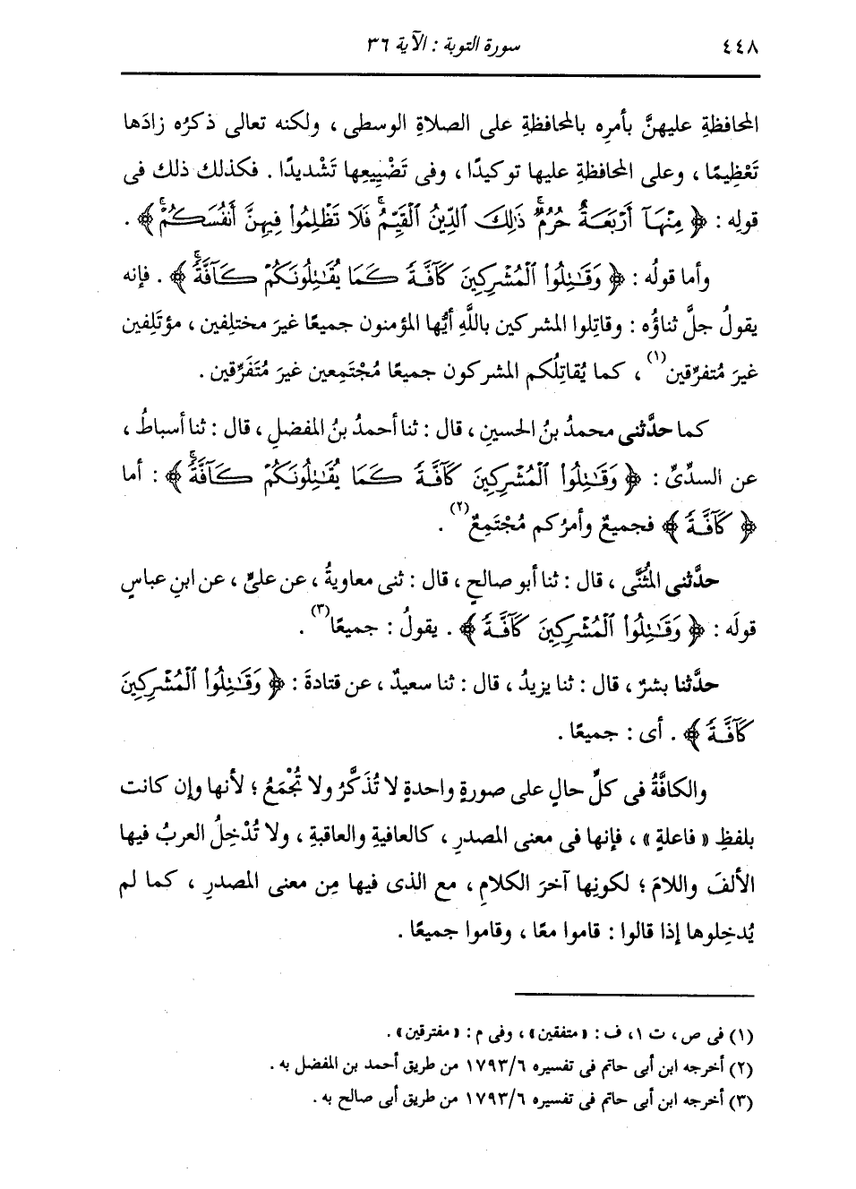 حَدَّثَنَا بِشْرٌ، قَالَ: ثنا يَزِيدُ، قَالَ: ثنا سَعِيدٌ، عَنْ قَتَادَةَ: " {§وَقَاتِلُوا الْمُشْرِكِينَ كَافَّةً} [التوبة: 36] أَيْ جَمِيعًا " وَالْكَافَّةُ فِي كُلِّ حَالٍ عَلَى صُورَةٍ وَاحِدَةٍ لَا تُذَكَّرُ وَلَا تُجْمَعُ؛ لِأَنَّهَا وَإِنْ كَانَتْ بِلَفْظِ فَاعِلِهِ فَإِنَّهَا فِي مَعْنَى الْمَصْدَرِ كَالْعَافِيَةِ وَالْعَاقِبَةِ، وَلَا تُدْخِلُ الْعَرَبُ فِيهَا الْأَلْفَ وَاللَّامَ لِكَوْنِهَا آخِرَ الْكَلَامِ مَعَ الَّذِي فِيهَا مِنْ مَعْنَى الْمَصْدَرِ، كَمَا لَمْ يُدْخِلُوهَا إِذَا قَالُوا: قَامُوا مَعًا وَقَامُوا جَمِيعًا