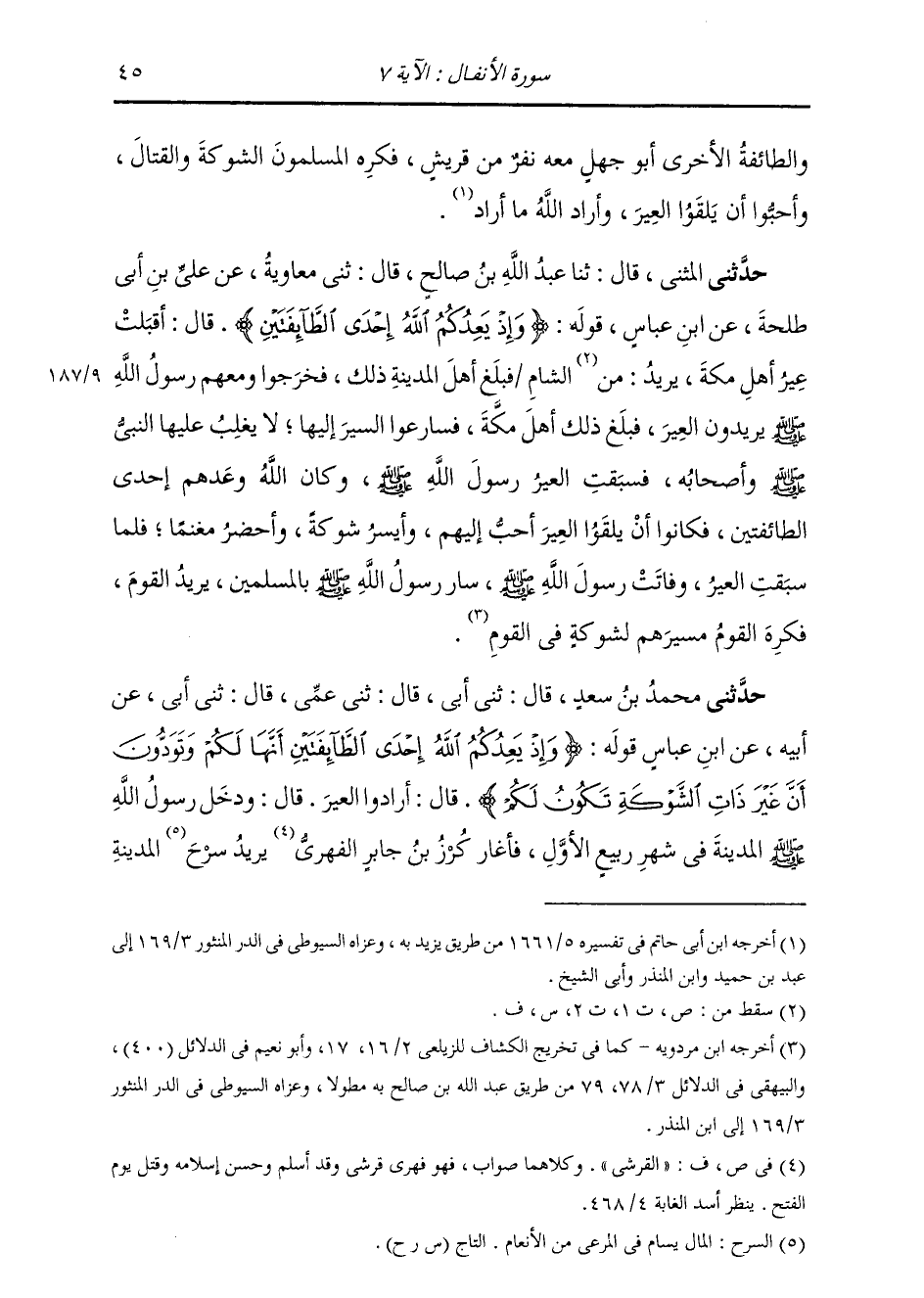 حَدَّثَنِي الْمُثَنَّى، قَالَ: ثنا عَبْدُ اللَّهِ بْنُ صَالِحٍ، قَالَ: ثني مُعَاوِيَةُ، عَنْ عَلِيِّ بْنِ أَبِي طَلْحَةَ، عَنِ ابْنِ عَبَّاسٍ، قَوْلُهُ: " {§وَإِذْ يَعِدُكُمُ اللَّهُ إِحْدَى الطَّائِفَتَيْنِ} [الأنفال: 7] قَالَ: أَقْبَلَتْ عِيرُ أَهْلِ مَكَّةَ يُرِيدُ: مِنَ الشَّامِ فَبَلَغَ أَهْلَ الْمَدِينَةِ ذَلِكَ، فَخَرَجُوا وَمَعَهُمْ رَسُولُ اللَّهِ صَلَّى اللهُ عَلَيْهِ وَسَلَّمَ يُرِيدُونَ الْعِيرَ، فَبَلَغَ ذَلِكَ أَهْلَ مَكَّةَ، فَسَارَعُوا السَّيْرَ إِلَيْهَا لَا يَغْلِبُ عَلَيْهَا النَّبِيُّ صَلَّى اللهُ عَلَيْهِ وَسَلَّمَ وَأَصْحَابُهُ، فَسَبَقْتُ الْعِيرُ رَسُولَ اللَّهِ صَلَّى اللهُ عَلَيْهِ وَسَلَّمَ، وَكَانَ اللَّهُ وَعَدَهُمْ إِحْدَى الطَّائِفَتَيْنِ، فَكَانُوا أَنْ يَلْقَوُا الْعِيرَ أَحَبَّ إِلَيْهِمْ وَأَيْسَرَ شَوْكَةً وَأَحْضَرَ مَغْنَمًا. فَلَمَّا سَبَقَتِ الْعِيرُ، وَفَاتَتْ رَسُولَ اللَّهِ صَلَّى اللهُ عَلَيْهِ وَسَلَّمَ، سَارَ رَسُولُ اللَّهِ صَلَّى اللهُ عَلَيْهِ وَسَلَّمَ بِالْمُسْلِمِينَ يُرِيدُ الْقَوْمَ، فَكَرِهَ الْقَوْمُ مَسِيرَهُمْ لِشَوْكَةٍ فِي الْقَوْمِ "