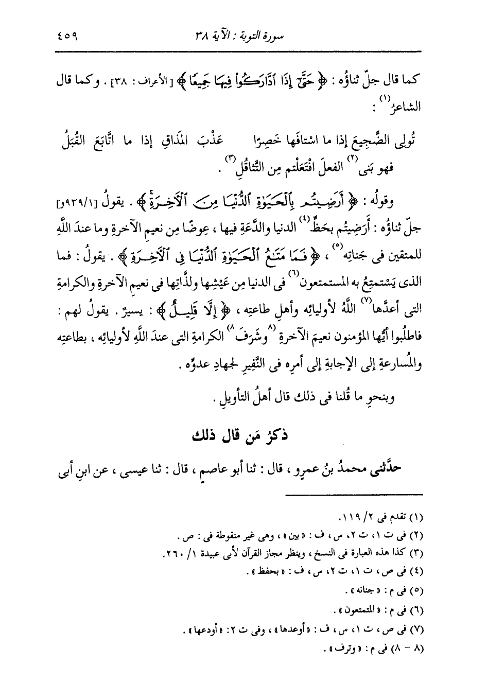 §وَقَوْلُهُ: {أَرَضِيتُمْ بِالْحَيَاةِ الدُّنْيَا مِنَ الْآخِرَةِ} [التوبة: 38] يَقُولُ جَلَّ ثَنَاؤُهُ أَرَضِيتُمْ بِحَظِّ الدُّنْيَا وَالدَّعَةِ فِيهَا عِوَضًا مِنْ نَعِيمِ الْآخِرَةِ وَمَا عِنْدَ اللَّهِ لِلْمُتَّقِينَ فِي جِنَانِهِ؟ {فَمَا مَتَاعُ الْحَيَاةِ الدُّنْيَا فِي الْآخِرَةِ} [التوبة: 38] يَقُولُ: فَمَا الَّذِي يُسْتَمْتَعُ بِهِ الْمُتَمَتِّعُونَ فِي الدُّنْيَا مِنْ عَيْشِهَا وَلَّذَاتِهَا فِي نَعِيمِ الْآخِرَةِ وَالْكَرَامَةِ الَّتِي أَعَدَّهَا اللَّهُ لِأَوْلِيَائِهِ وَأَهْلِ طَاعَتِهِ {إِلَّا قَلِيلٌ} [النساء: 66] يَسِيرٌ. يَقُولُ لَهُمْ: فَاطْلُبُوا أَيُّهَا الْمُؤْمِنُونَ نَعِيمَ الْآخِرَةِ وَتَرَفَ الْكَرَامَةِ الَّتِي عِنْدَ اللَّهِ لِأَوْلِيَائِهِ بِطَاعَتِهِ، وَالْمُسَارَعَةِ إِلَى الْإِجَابَةِ إِلَى أَمْرِهِ فِي النَّفِيرِ لِجِهَادِ عَدُوِّهِ. وَبِنَحْوِ مَا قُلْنَا فِي ذَلِكَ قَالَ أَهْلُ التَّأْوِيلِ