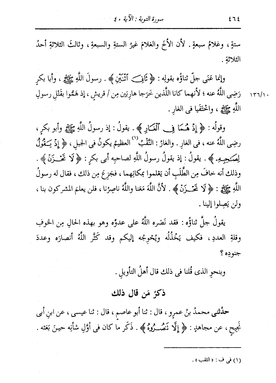 ذِكْرُ مَنْ قَالَ ذَلِكَ: حَدَّثَنِي مُحَمَّدُ بْنُ عَمْرٍو، قَالَ: ثنا أَبُو عَاصِمٍ، قَالَ: ثنا عِيسَى، عَنِ ابْنِ أَبِي نَجِيحٍ، عَنْ مُجَاهِدٍ: " {§إِلَّا تَنْصُرُوهُ} [التوبة: 40] ذِكْرُ مَا كَانَ فِي أَوَّلِ شَأْنِهِ حِينَ بَعَثَهُ، -[465]- يَقُولُ اللَّهُ: فَأَنَا فَاعِلٌ ذَلِكَ بِهِ وَنَاصِرُهُ كَمَا نُصَرْتُهُ إِذْ ذَاكَ وَهُوَ ثَانِيَ اثْنَيْنِ "