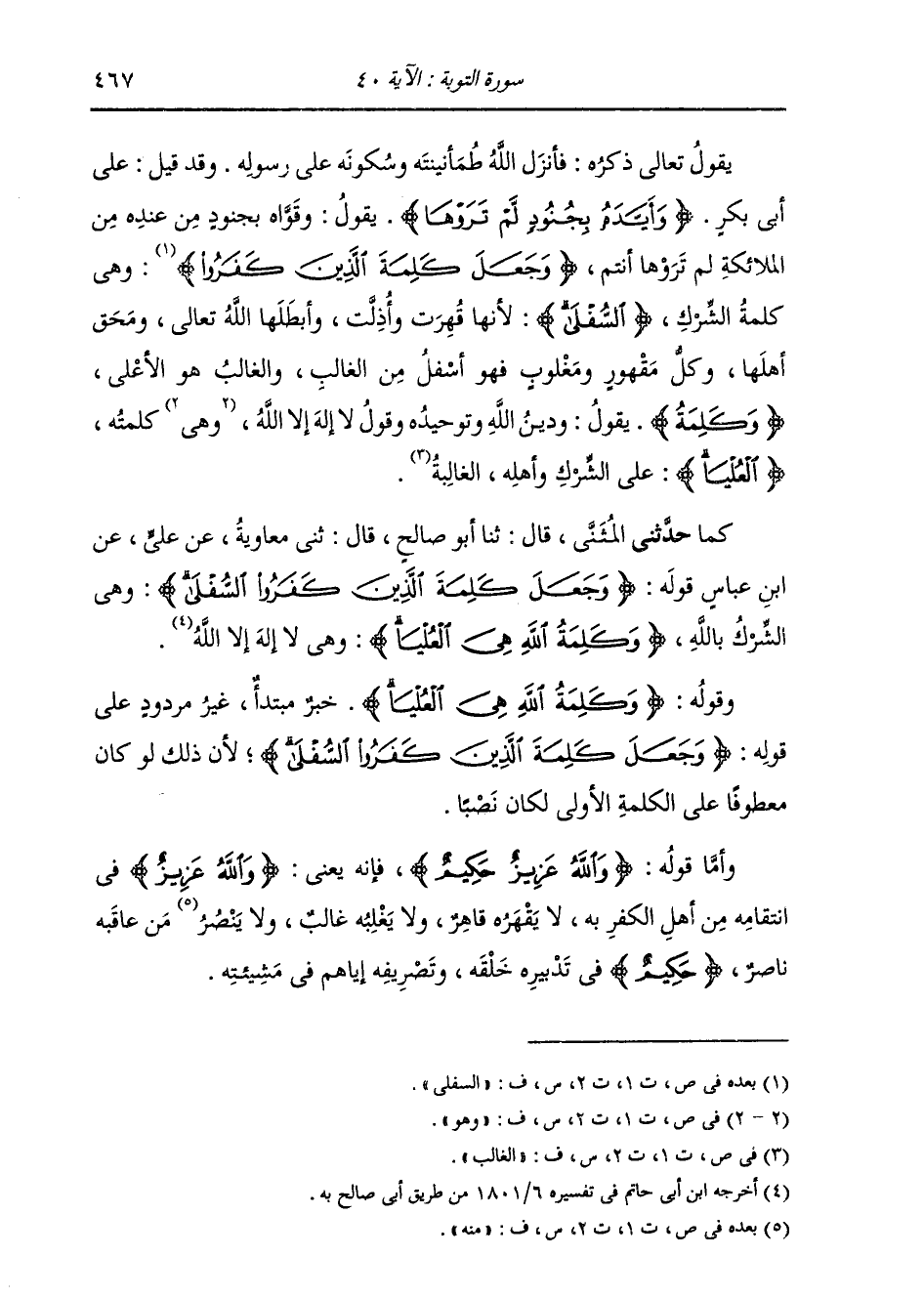 كَمَا: حَدَّثَنِي الْمُثَنَّى، قَالَ: ثنا أَبُو صَالِحٍ، قَالَ: ثني مُعَاوِيَةُ، عَنْ عَلِيٍّ، عَنِ ابْنِ عَبَّاسٍ، قَوْلُهُ: " {§وَجَعَلَ كَلِمَةَ الَّذِينَ كَفَرُوا السُّفْلَى} [التوبة: 40] وَهِيَ: الشِّرْكُ بِاللَّهِ. {وَكَلِمَةُ اللَّهِ هِيَ الْعُلْيَا} [التوبة: 40] وَهِيَ لَا إِلَهَ إِلَّا اللَّهِ "