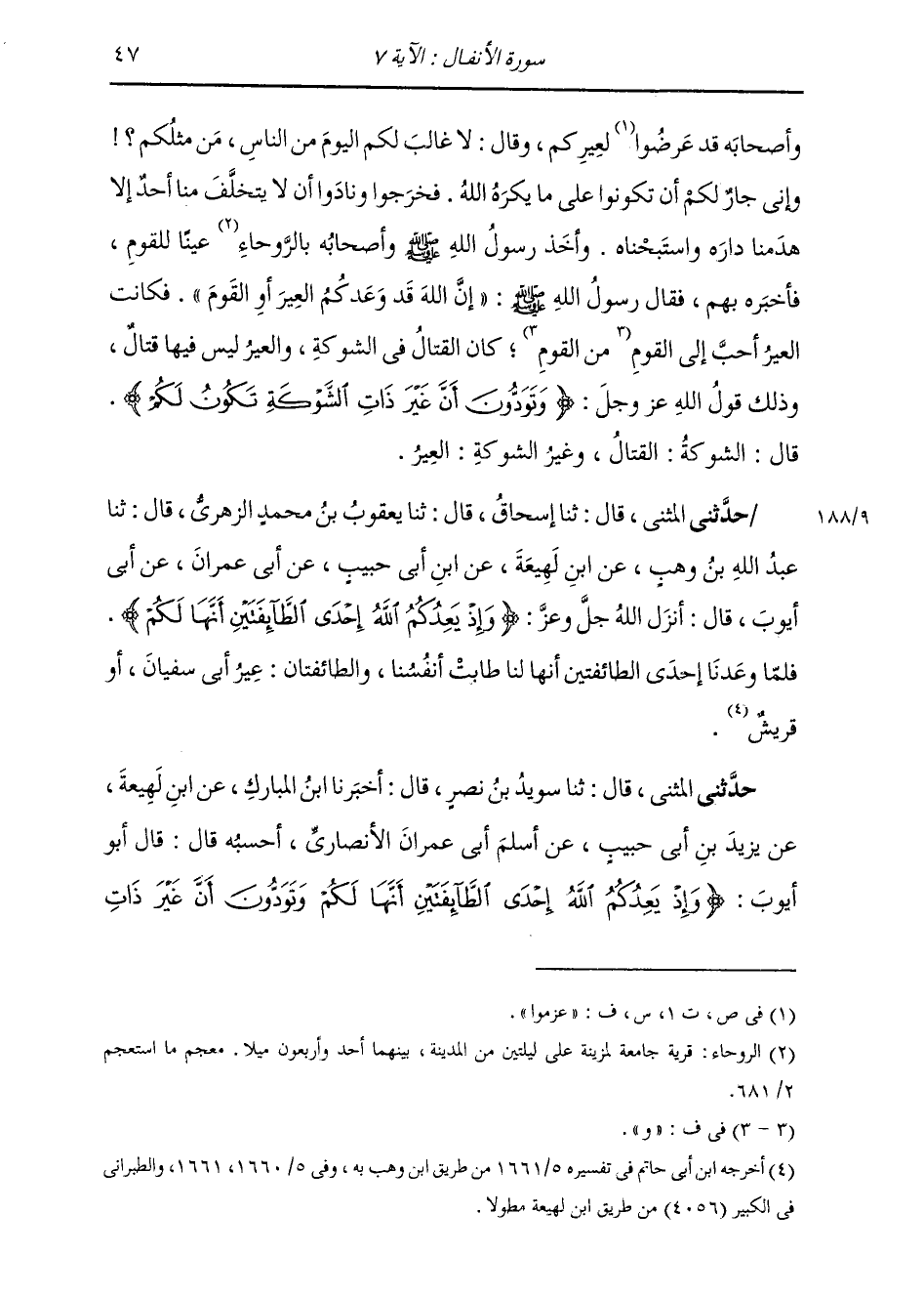 حَدَّثَنِي الْمُثَنَّى قَالَ: ثنا سُوَيْدُ بْنُ نَصْرٍ قَالَ: أَخْبَرَنَا ابْنُ الْمُبَارَكِ، عَنِ ابْنِ لَهِيعَةَ، عَنْ يَزِيدَ بْنِ أَبِي حَبِيبٍ، عَنْ أَسْلَمَ أَبِي عِمْرَانَ الْأَنْصَارِيِّ، أَحْسِبُهُ قَالَ: قَالَ أَبُو أَيُّوبَ: " {§وَإِذْ يَعِدُكُمُ اللَّهُ إِحْدَى الطَّائِفَتَيْنِ أَنَّهَا لَكُمْ وَتَوَدُّونَ أَنَّ غَيْرَ ذَاتِ -[48]- الشَّوْكَةِ تَكُونُ لَكُمْ} [الأنفال: 7] قَالُوا: الشَّوْكَةُ: الْقَوْمُ وَغَيْرُ الشَّوْكَةِ: الْعِيرُ، فَلَمَّا وَعَدَنَا اللَّهُ إِحْدَى الطَّائِفَتَيْنِ: إِمَّا الْعِيرُ، وَإِمَّا الْقَوْمُ، طَابَتْ أَنْفُسُنَا "