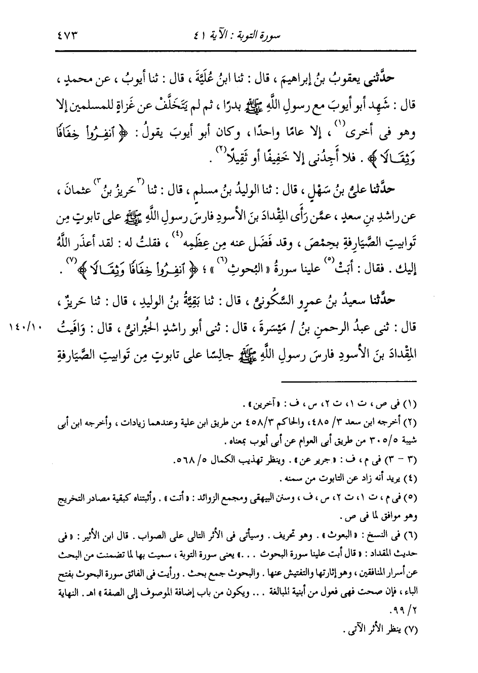 حَدَّثَنَا سَعِيدُ بْنُ عَمْرٍو السَّكُونِيُّ، قَالَ: ثنا بَقِيَّةُ بْنُ الْوَلِيدِ، قَالَ: ثنا جَرِيرٌ، قَالَ: ثني عَبْدُ الرَّحْمَنِ بْنُ مَيْسَرَةَ، قَالَ: ثني أَبُو رَاشِدٍ الْحُبْرَانِيُّ، قَالَ: وَافَيْتُ الْمِقْدَادَ بْنَ الْأَسْوَدِ فَارِسَ رَسُولِ اللَّهِ صَلَّى اللهُ عَلَيْهِ وَسَلَّمَ جَالِسًا عَلَى تَابُوتٍ مِنْ تَوَابِيتِ الصَّيَارِفَةِ -[474]- بِحِمْصَ، قَدْ فَضُلَ عَنْهُ مِنْ عَظْمِهِ، يُرِيدُ الْغَزْوَ، فَقُلْتُ لَهُ: لَقَدْ أَعْذَرَ اللَّهُ إِلَيْكَ، فَقَالَ: " §أَتَتْ عَلَيْنَا سُورَةُ الْبَحُوثِ: {انْفِرُوا خِفَافًا وَثِقَالًا} [التوبة: 41] " قَالَ أَبُو جَعْفَرٍ: وَأَوْلَى الْأَقْوَالِ فِي ذَلِكَ عِنْدَنَا بِالصَّوَابِ أَنْ يُقَالَ: إِنَّ اللَّهَ تَعَالَى ذِكْرُهُ أَمَرَ الْمُؤْمِنِينَ بِالنَّفْرِ لِجِهَادِ أَعْدَائِهِ فِي سَبِيلِهِ خِفَافًا وَثِقَالًا، وَقَدْ يَدْخُلُ فِي الْخِفَافِ كُلُّ مَنْ كَانَ سَهْلًا عَلَيْهِ النَّفْرُ لِقُوَّةِ بَدَنِهِ عَلَى ذَلِكَ وَصِحَّةِ جِسْمِهِ وَشَبَابِهِ، وَمَنْ كَانَ ذَا تَيَسُّرٍ بِمَالٍ وَفَرَاغٍ مِنَ الِاشْتِغَالِ وَقَادِرًا عَلَى الظَّهْرِ وَالرِّكَابِ. وَيَدْخُلُ فِي الثِّقَالِ كُلُّ مَنْ كَانَ بِخِلَافِ ذَلِكَ مِنْ ضَعِيفِ الْجِسْمِ وَعَلِيلِهِ وَسَقِيمِهِ، وَمِنْ مُعَمَّرٍ مِنَ الْمَالِ وَمُشْتَغِلٍ بِضَيْعَةٍ وَمَعاشٍ، وَمَنْ كَانَ لَا ظَهْرَ لَهُ وَلَا رِكَابَ، وَالشَّيْخُ وَذُو السِّنِّ وَالْعِيَالِ. فَإِذْ كَانَ قَدْ يَدْخُلُ فِي الْخَفَّافِ وَالثِّقَالِ مَنْ وَصَفْنَا مِنْ أَهْلِ الصِّفَاتِ الَّتِي ذَكَرْنَا وَلَمْ يَكُنِ اللَّهُ جَلَّ ثَنَاؤُهُ خَصَّ مِنْ ذَلِكَ صِنْفًا دُونَ صِنْفٍ فِي الْكِتَابِ، وَلَا عَلَى لِسَانِ الرَّسُولِ صَلَّى اللهُ عَلَيْهِ وَسَلَّمَ، وَلَا نَصَبَ عَلَى خُصُوصِهِ دَلِيلًا، وَجَبَ أَنْ يُقَالَ: إِنَّ اللَّهَ جَلَّ ثَنَاؤُهُ أَمَرَ الْمُؤْمِنِينَ مِنْ أَصْحَابِ رَسُولِهِ بِالنَّفْرِ لِلْجِهَادِ فِي سَبِيلِهِ خِفَافًا وَثِقَالًا مَعَ رَسُولِهِ صَلَّى اللهُ عَلَيْهِ وَسَلَّمَ عَلَى كُلِّ حَالٍ مِنْ أَحْوَالِ الْخِفَّةِ وَالثِّقَلِ
