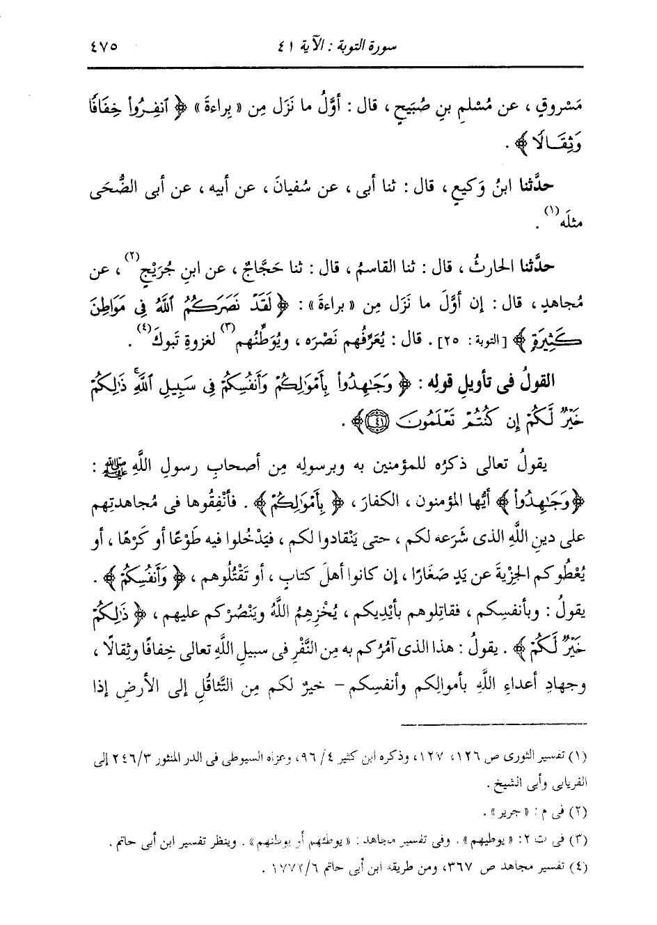 §الْقَوْلُ فِي تَأْوِيلِ قَوْلِهِ تَعَالَى: {وَجَاهِدُوا بِأَمْوَالِكُمْ وَأَنْفُسِكُمْ فِي سَبِيلِ اللَّهِ ذَلِكُمْ خَيْرٌ لَّكُمْ إِن كُنْتُمْ تَعْلَمُونَ} [التوبة: 41] يَقُولُ تَعَالَى ذِكْرُهُ لِلْمُؤْمِنِينَ بِهِ وَبِرَسُولِهِ مِنْ أَصْحَابِ رَسُولِ اللَّهِ صَلَّى اللهُ عَلَيْهِ وَسَلَّمَ: جَاهِدُوا أَيُّهَا الْمُؤْمِنُونَ الْكُفَّارَ بِأَمْوَالِكُمْ، فَأَنْفِقُوهَا فِي مُجَاهَدَتِهِمْ عَلَى دِينِ اللَّهِ الَّذِي شَرَعَهُ لَكُمْ، حَتَّى يَنْقَادُوا لَكُمْ فَيَدْخُلُوا فِيهِ طَوْعًا أَوْ كَرْهًا، أَوْ يُعْطُوكُمُ الْجِزْيَةَ عَنْ يَدٍ صِغَارًا إِنْ كَانُوا أَهْلَ كِتَابٍ، أَوْ تَقْتُلُوهُمْ. {وَأَنْفُسِكُمْ} [آل عمران: 61] يَقُولُ: وَبِأَنْفُسِكُمْ فَقَاتِلُوهُمْ بِأَيْدِيكُمْ يُخْزِهِمُ اللَّهُ وَيَنْصُرْكُمْ عَلَيْهِمْ. {ذَلِكُمْ خَيْرٌ لَكُمْ} [البقرة: 54] يَقُولُ: هَذَا الَّذِي آمُرُكُمْ بِهِ مِنَ النَّفْرِ فِي سَبِيلِ اللَّهِ تَعَالَى خِفَافًا وَثِقَالًا وَجِهَادِ أَعْدَائِهِ بِأَمْوَالِكُمْ وَأَنْفُسِكُمْ خَيْرٌ لَكُمْ مِنَ التَّثَاقُلِ إِلَى الْأَرْضِ إِذَا