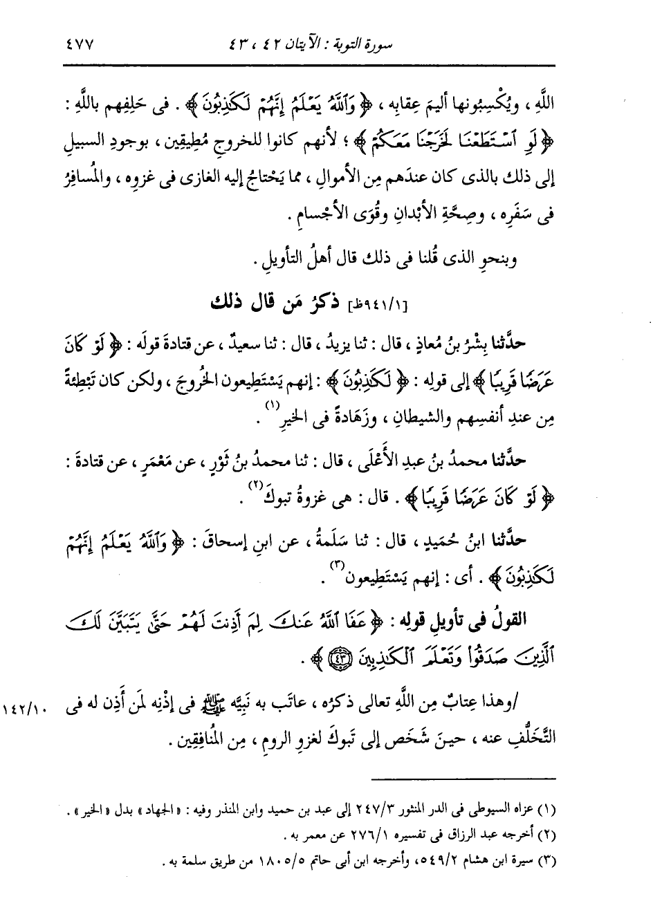 حَدَّثَنَا ابْنُ حُمَيْدٍ، قَالَ: ثنا سَلَمَةُ، عَنِ ابْنِ إِسْحَاقَ: " {§وَاللَّهُ يَعْلَمُ إِنَّهُمْ لَكَاذِبُونَ} [التوبة: 42] أَيْ: إِنَّهُمْ يَسْتَطِيعُونَ " ذِكْرُ مَنْ قَالَ ذَلِكَ: {عَفَا اللهُ عَنكَ لِمَ أَذِنتَ لَهُمْ حَتَّى يَتَبَيَّنَ لَكَ الَّذِينَ صَدَقُوا وَتَعْلَمَ الْكَاذِبِينَ} [التوبة: 43] وَهَذَا عَتَّابٌ مِنَ اللَّهِ تَعَالَى ذِكْرُهُ عَاتَبَ بِهِ نَبِيَّهُ صَلَّى اللهُ عَلَيْهِ وَسَلَّمَ فِي إِذْنِهِ لِمَنْ أَذِنَ لَهُ فِي التَّخَلُّفِ عَنْهُ حِينَ شَخَصَ إِلَى تَبُوكَ لِغَزْوِ الرُّومِ مِنَ الْمُنَافِقِينَ. -[478]- يَقُولُ جَلَّ ثَنَاؤُهُ: {عَفَا اللَّهُ عَنْكَ} [التوبة: 43] يَا مُحَمَّدُ مَا كَانَ مِنْكَ فِي إِذْنِكَ لِهَؤُلَاءِ الْمُنَافِقِينَ الَّذِي اسْتَأْذَنُوكَ فِي تَرْكِ الْخُرُوجِ مَعَكَ، وَفِي التَّخَلُّفِ عَنْكَ مِنْ قَبْلِ أَنْ تَعْلَمَ صِدْقَهُ مِنْ كَذِبِهِ. {لِمَ أَذِنْتَ لَهُمْ} [التوبة: 43] لِأَيِّ شَيْءٍ أَذِنْتَ لَهُمْ. {حَتَّى يَتَبَيَّنَ لَكَ الَّذِينَ صَدَقُوا وَتَعْلَمَ الْكَاذِبِينَ} [التوبة: 43] يَقُولُ: مَا كَانَ يَنْبَغِي لَكَ أَنْ تَأْذَنَ لَهُمْ فِي التَّخَلُّفِ عَنْكَ؛ إِذْ قَالُوا لَكَ: لَوِ اسْتَطَعْنَا لَخَرَجْنَا مَعَكَ، حَتَّى تَعْرِفَ مَنْ لَهُ الْعُذْرُ مِنْهُمْ فِي تَخَلُّفِهِ وَمَنْ لَا عُذْرَ لَهُ مِنْهُمْ، فَيَكُونُ إِذْنُكَ لِمَنْ أَذِنْتَ لَهُ مِنْهُمْ عَلَى عِلْمٍ مِنْكَ بِعُذْرِهِ، وَتَعْلَمَ مَنِ الْكَاذِبُ مِنْهُمُ الْمُتَخَلِّفُ نِفَاقًا وَشَكًّا فِي دِينِ اللَّهِ. وَبِنَحْوِ الَّذِي قُلْنَا فِي ذَلِكَ قَالَ أَهْلُ التَّأْوِيلِ