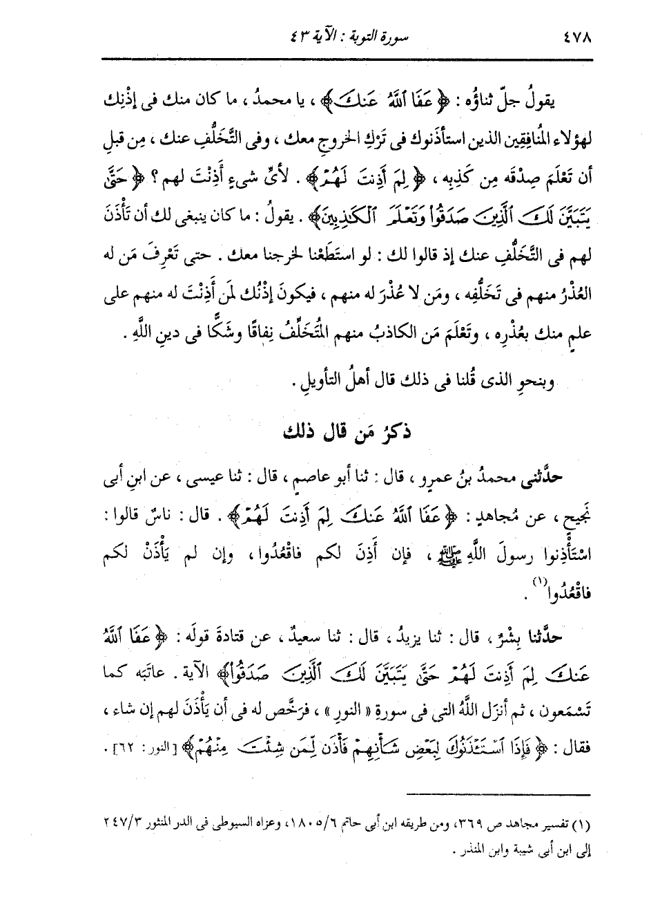 ذِكْرُ مَنْ قَالَ ذَلِكَ: حَدَّثَنَا مُحَمَّدُ بْنُ عَمْرٍو، قَالَ: ثنا أَبُو عَاصِمٍ، قَالَ: ثنا عِيسَى، عَنِ ابْنِ أَبِي نَجِيحٍ، عَنْ مُجَاهِدٍ: " {§عَفَا اللَّهُ عَنْكَ لِمَ أَذِنْتَ لَهُمْ} [التوبة: 43] قَالَ: نَاسٌ قَالُوا: اسْتَأْذِنُوا رَسُولَ اللَّهِ صَلَّى اللهُ عَلَيْهِ وَسَلَّمَ، فَإِنْ أَذِنَ لَكُمْ فَاقْعُدُوا وَإِنْ لَمْ يَأْذَنْ لَكُمْ فَاقْعُدُوا "