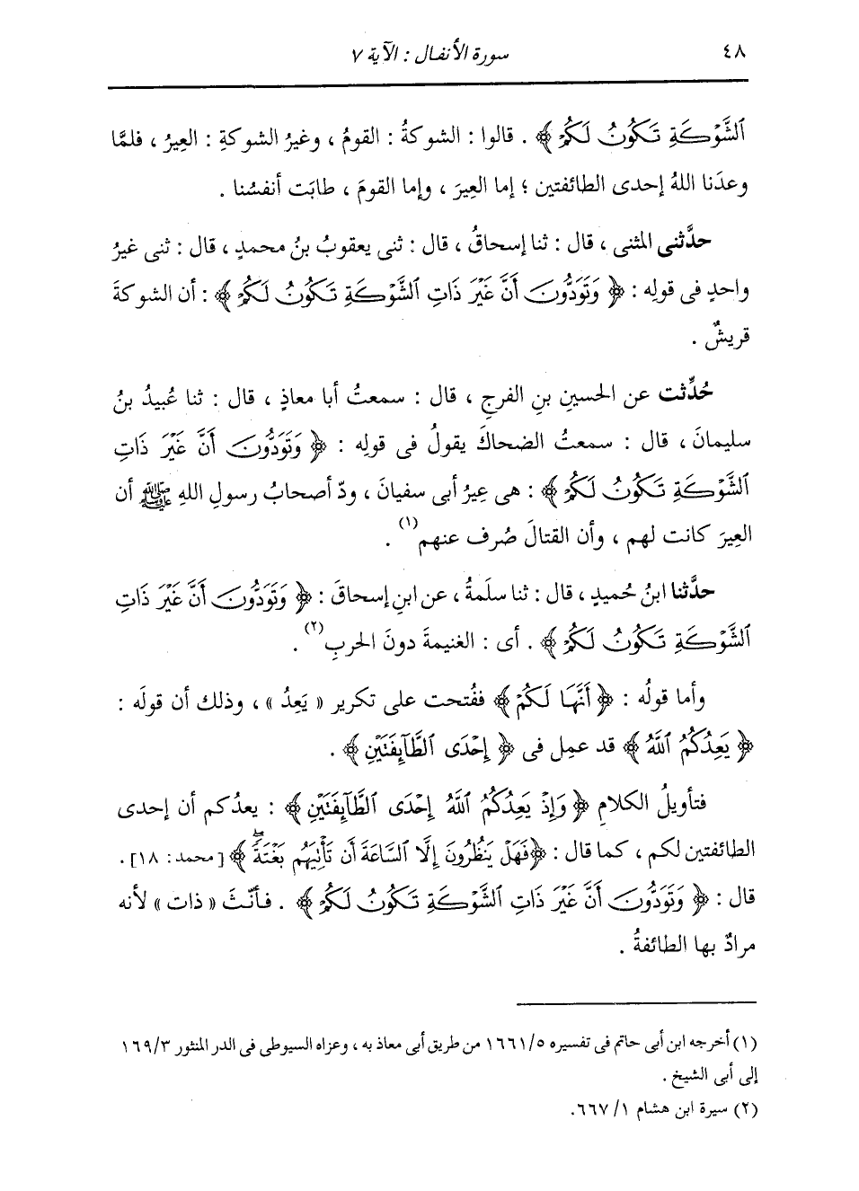 حَدَّثَنَا ابْنُ حُمَيْدٍ، قَالَ: ثنا سَلَمَةُ، عَنِ ابْنِ إِسْحَاقَ: " {§وَتَوَدُّونَ أَنَّ غَيْرَ ذَاتِ الشَّوْكَةِ تَكُونُ لَكُمْ} [الأنفال: 7] أَيْ: الْغَنِيمَةُ دُونَ الْحَرْبِ "