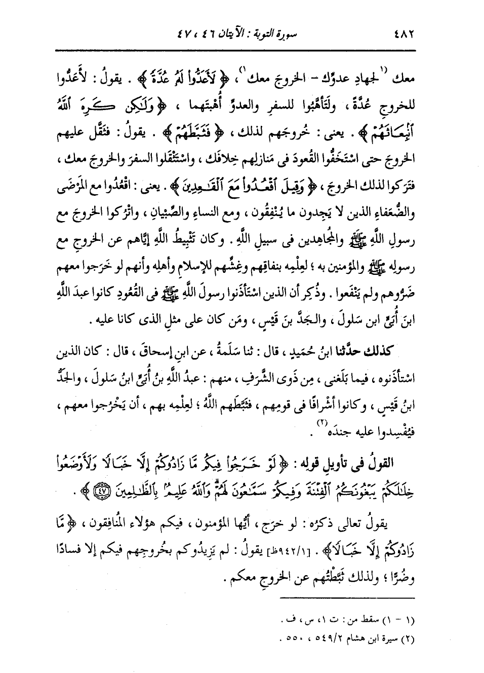 مَعَكَ لِجِهَادِ عَدُوِّكَ الْخُرُوجَ مَعَكَ. {لَأَعَدُّوا لَهُ عُدَّةً} [التوبة: 46] يَقُولُ: لَأَعَدُّوا لِلْخُرُوجِ عُدَّةً، وَلَتَأَهَّبُوا لِلسَّفَرِ وَالْعَدُوِّ أُهْبَتَهُمَا. {وَلَكِنْ كَرِهَ اللَّهُ انْبِعَاثَهُمْ} [التوبة: 46] يَعْنِي: خُرُوجَهُمْ لِذَلِكَ. {فَثَبَّطَهُمْ} [التوبة: 46] يَقُولُ: فَثَقُلَ عَلَيْهِمُ الْخُرُوجُ حَتَّى اسْتَخَفُّوا الْقُعُودَ فِي مَنَازِلِهِمْ خِلَافَكَ، وَاسْتَثْقَلُوا السَّفَرَ وَالْخُرُوجَ مَعَكَ، فَتَرَكُوا لِذَلِكَ الْخُرُوجَ. {وَقِيلَ اقْعُدُوا مَعَ الْقَاعِدِينَ} [التوبة: 46] يَعْنِي: اقْعُدُوا مَعَ الْمَرْضَى وَالضُّعَفَاءِ الَّذِينَ لَا يَجِدُونَ مَا يُنْفِقُونَ وَمَعَ النِّسَاءِ وَالصِّبْيَانِ، وَاتْرُكُوا الْخُرُوجَ مَعَ رَسُولِ اللَّهِ صَلَّى اللهُ عَلَيْهِ وَسَلَّمَ وَالْمُجَاهِدِينَ فِي سَبِيلِ اللَّهِ. وَكَانَ تَثْبِيطُ اللَّهِ إِيَّاهُمْ عَنِ الْخُرُوجِ مَعَ رَسُولِهِ صَلَّى اللهُ عَلَيْهِ وَسَلَّمَ وَالْمُؤْمِنِينَ بِهِ، لِعِلْمِهِ بِنِفَاقِهِمْ، وَغِشِّهِمْ لِلْإِسْلَامِ وَأَهْلِهِ، وَأَنَّهُمْ لَوْ خَرَجُوا مَعَهُمْ ضَرُّوهُمْ وَلَمْ يَنْفَعُوا. وَذُكِرَ أَنَّ الَّذِينَ اسْتَأْذَنُوا رَسُولَ اللَّهِ صَلَّى اللهُ عَلَيْهِ وَسَلَّمَ فِي الْقُعُودِ كَانُوا عَبْدَ اللَّهِ بْنَ أُبَيٍّ ابْنَ سَلُولَ، وَالْجَدَّ بْنَ قَيْسٍ، وَمَنْ كَانَا عَلَى مِثْلِ الَّذِي كَانَا عَلَيْهِ