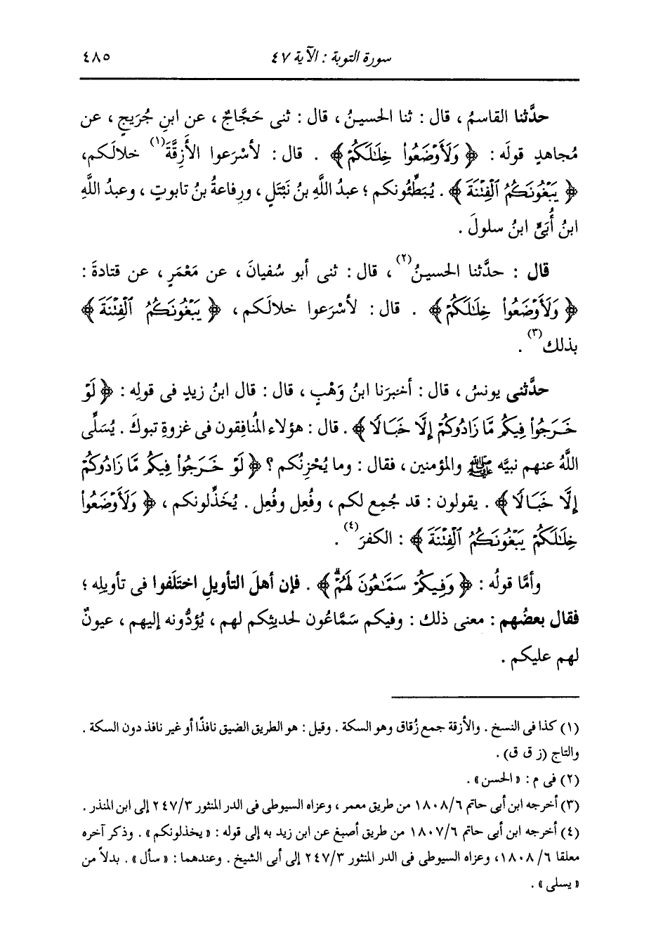 حَدَّثَنَا الْقَاسِمُ، قَالَ: ثنا الْحُسَيْنُ، قَالَ: ثني حَجَّاجٌ، عَنِ ابْنِ جُرَيْجٍ، عَنْ مُجَاهِدٍ، قَوْلُهُ: " {§وَلَأَوْضَعُوا خِلَالَكُمْ} [التوبة: 47] قَالَ: لَأَسْرَعُوا الْأَزِقَّةَ خِلَالَكُمْ {يَبْغُونَكُمُ الْفِتْنَةَ} [التوبة: 47] يُبَطَّئُونَكُمْ، عَبْدُ اللَّهِ بْنُ نَبْتِلٍ، وَرِفَاعَةُ بْنُ تَابُوتٍ، وَعَبْدُ اللَّهِ بْنُ أُبَيٍّ ابْنُ سَلُولَ "