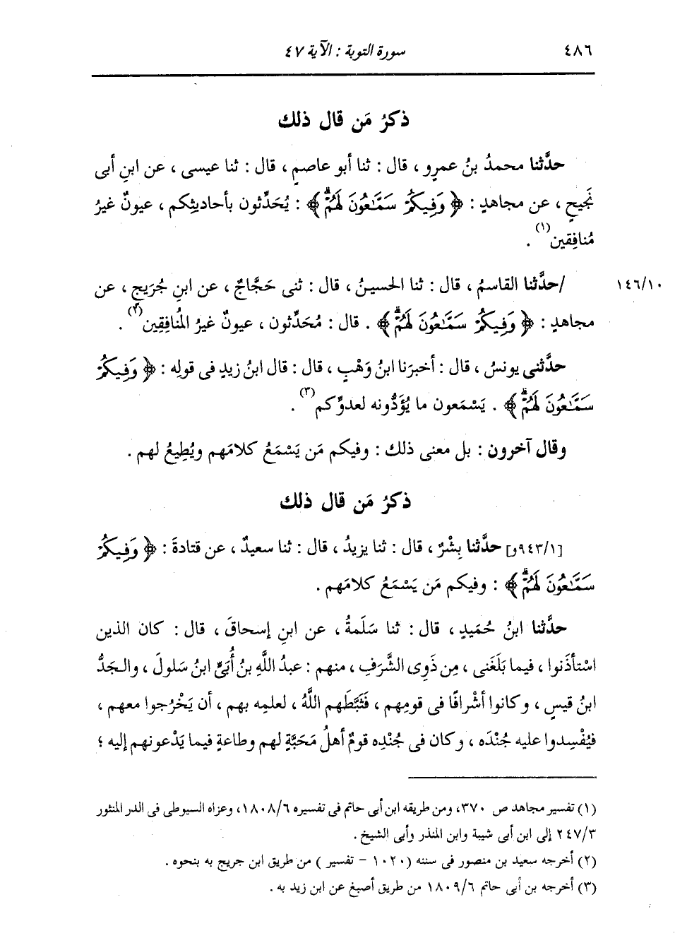 حَدَّثَنَا الْقَاسِمُ، قَالَ: ثنا الْحُسَيْنُ، قَالَ: ثني حَجَّاجٌ، عَنِ ابْنِ جُرَيْجٍ، عَنْ مُجَاهِدٍ: " {§وَفِيكُمْ سَمَّاعُونَ لَهُمْ} [التوبة: 47] قَالَ: مُحَدِّثُونَ عُيُونٌ غَيْرُ مُنَافِقِينَ "