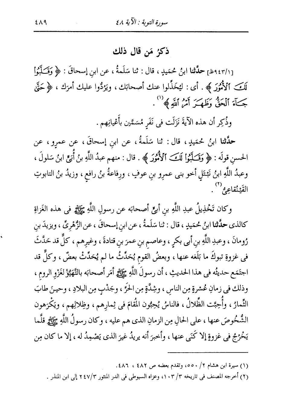 ذِكْرُ مَنْ قَالَ ذَلِكَ: حَدَّثَنَا ابْنُ حُمَيْدٍ، قَالَ: ثنا سَلَمَةُ، عَنِ ابْنِ إِسْحَاقَ: " {§وَقَلَّبُوا لَكَ الْأُمُورَ} [التوبة: 48] أَيْ لِيُخَذِّلُوا عَنْكَ أَصْحَابَكَ، وَيَرُدُّوا عَلَيْكَ أَمْرَكَ. {حَتَّى جَاءَ الْحَقُّ وَظَهَرَ أَمْرُ اللَّهِ} [التوبة: 48] " وَذُكِرَ أَنَّ هَذِهِ الْآيَةَ نَزَلَتْ فِي نَفَرٍ مُسَمَّيْنَ بِأَعْيَانِهِمْ