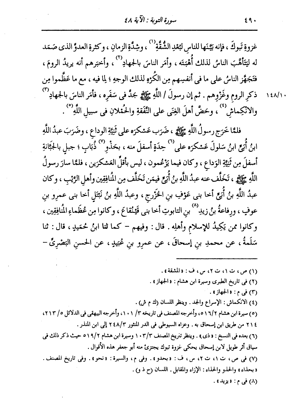 غَزْوَةِ تَبُوكَ، فَإِنَّهُ بَيَّنَهَا لِلنَّاسِ لِبُعْدِ الشُّقَّةِ وَشِدَّةِ الزَّمَانِ وَكَثْرَةِ الْعَدُوِّ الَّذِي صَمَدَ لَهُ لِيَتَأَهَّبَ النَّاسُ لِذَلِكَ أُهْبَتَهُ. فَأَمَّ النَّاسَ بِالْجِهَادِ، وَأَخْبِرْهُمْ أَنَّهُ يُرِيدُ الرُّومَ، فَتَجَهَّزَ النَّاسُ عَلَى مَا فِي أَنْفُسِهِمْ مِنَ الْكُرْهِ لِذَلِكَ الْوَجْهِ لِمَا فِيهِ، مَعَ مَا عَظَّمُوا مِنْ ذِكْرِ الرُّومِ وَغَزْوِهِمْ. ثُمَّ إِنَّ رَسُولَ اللَّهِ صَلَّى اللهُ عَلَيْهِ وَسَلَّمَ جَدَّ فِي سَفَرِهِ، فَأَمَرَ النَّاسَ بِالْجِهَازِ وَالِانْكِمَاشِ، وَحَضَّ أَهْلَ الْغِنَى عَلَى النَّفَقَةِ وَالْحُمْلَانِ فِي سَبِيلِ اللَّهِ. فَلَمَّا خَرَجَ رَسُولُ اللَّهِ صَلَّى اللهُ عَلَيْهِ وَسَلَّمَ ضَرَبَ عَسْكَرَهُ عَلَى ثَنِيَّةِ الْوَدَاعِ، وَضَرَبَ عَبْدُ اللَّهِ بْنُ أُبَيٍّ ابْنُ سَلُولَ عَسْكَرَهُ عَلَى ذِي حِدَةٍ أَسْفَلَ مِنْهُ نَحْوَ ذُبَابِ جَبَلٍ بِالْجَبَّانَةِ أَسْفَلَ مِنْ ثَنِيَّةِ الْوَدَاعِ وَكَانَ فِيمَا يَزْعُمُونَ لَيْسَ بِأَقَلِّ الْعَسْكَرَيْنِ، فَلَمَّا سَارَ رَسُولُ اللَّهِ صَلَّى اللهُ عَلَيْهِ وَسَلَّمَ تَخَلَّفَ عَنْهُ عَبْدُ اللَّهِ بْنُ أُبَيٍّ فِيمَنْ تَخَلَّفَ مِنَ الْمُنَافِقِينَ وَأَهْلِ الرِّيَبِ، وَكَانَ عَبْدُ اللَّهِ بْنُ أُبَيٍّ أَخَا بَنِي عَوْفِ بْنِ الْخَزْرَجِ، وَعَبْدُ اللَّهِ بْنُ نَبْتَلٍ أَخَا بَنِي عَمْرِو بْنِ عَوْفٍ، وَرِفَاعَةُ بْنُ زَيْدِ بْنِ التَّابُوتِ أَخَا بَنِي قَيْنُقَاعٍ، وَكَانُوا مِنْ عُظَمَاءِ الْمُنَافِقِينَ، وَكَانُوا مِمَّنْ يَكِيدُ لِلْإِسْلَامِ وَأَهْلِهِ» قَالَ: وَفِيهِمْ كَمَا ثنا ابْنُ حُمَيْدٍ، قَالَ: ثنا سَلَمَةُ، عَنْ مُحَمَّدِ بْنِ إِسْحَاقَ، عَنْ عَمْرِو بْنِ عُبَيْدٍ، عَنِ الْحَسَنِ الْبَصْرِيِّ