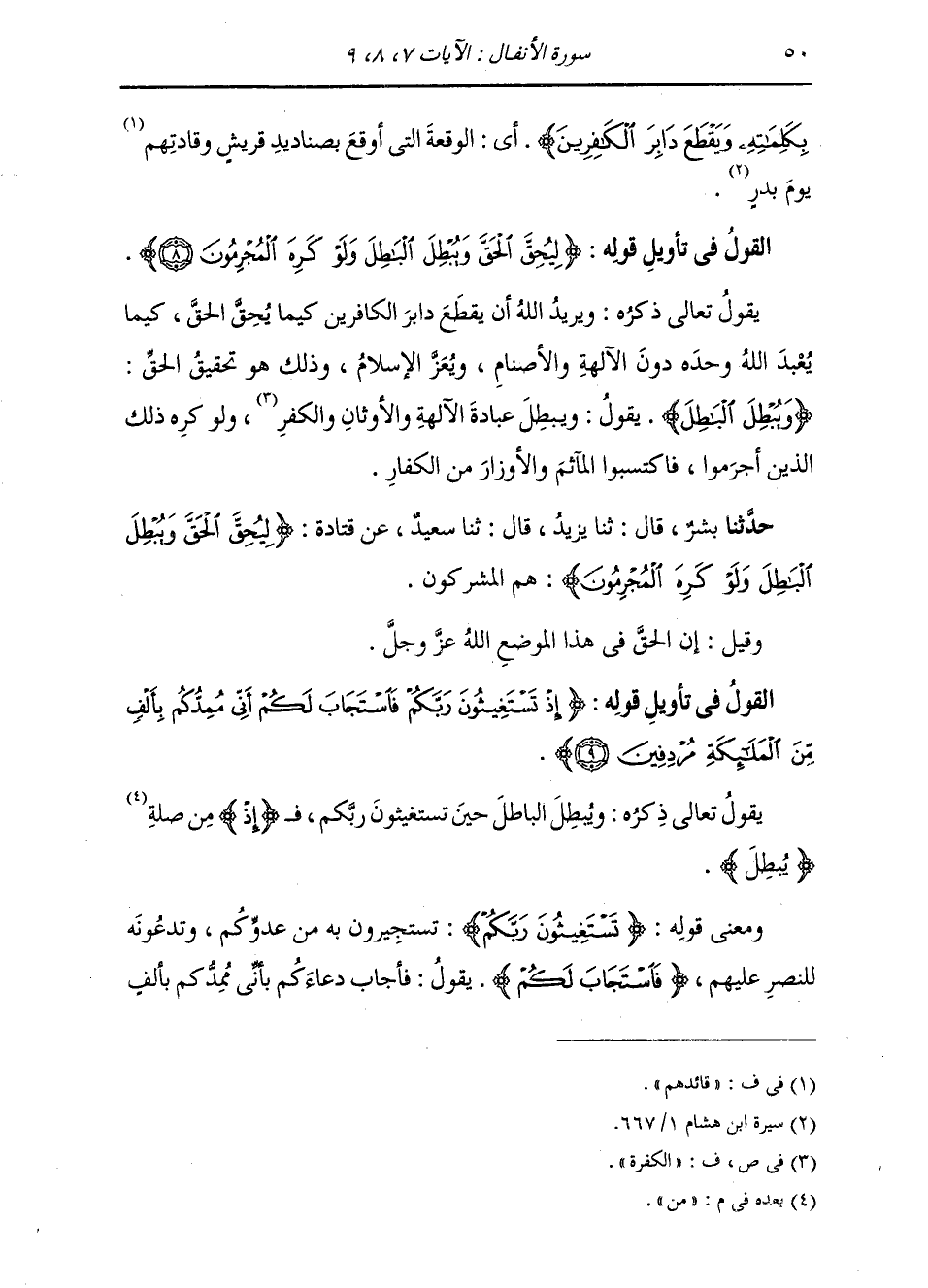 §الْقَوْلُ فِي تَأْوِيلِ قَوْلِهِ تَعَالَى: {إِذْ تَسْتَغِيثُونَ رَبَّكُمْ فَاسْتَجَابَ لَكُمْ أَنِّي مُمِدُّكُمْ بِأَلْفٍ مِّنَ الْمَلائِكَةِ مُرْدِفِينَ} [الأنفال: 9] يَقُولُ تَعَالَى ذِكْرُهُ: وَيُبْطِلَ الْبَاطِلَ حِينَ تَسْتَغِيثُونَ رَبَّكُمْ، فَـ «إِذْ» مِنْ صِلَةِ «يُبْطِلَ» وَمَعْنَى قَوْلِهِ: {تَسْتَغِيثُونَ رَبَّكُمْ} [الأنفال: 9] تَسْتَجِيرُونَ بِهِ مِنْ عَدُوِّكُمْ، وَتَدْعُونَهُ لِلنَّصْرِ عَلَيْهِمْ. {فَاسْتَجَابَ لَكُمْ} [الأنفال: 9] يَقُولُ: فَأَجَابَ دُعَاءَكُمْ بِأَنِّي مُمِدُّكُمْ بِأَلْفٍ -[51]- مِنَ الْمَلَائِكَةِ يَرْدَفُ بَعْضُهُمْ بَعْضًا وَيَتْلُو بَعْضُهُمْ بَعْضًا. وَبِنَحْوِ مَا قُلْنَا فِي ذَلِكَ قَالَ أَهْلُ التَّأْوِيلِ وَجَاءَتِ الرِّوَايَةُ عَنْ أَصْحَابِ رَسُولِ اللَّهِ صَلَّى اللهُ عَلَيْهِ وَسَلَّمَ