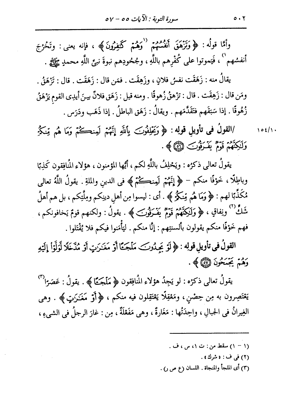 §وَأَمَّا قَوْلُهُ: {وَتَزْهَقَ أَنْفُسُهُمْ وَهُمْ كَافِرُونَ} [التوبة: 55] فَإِنَّهُ يَعْنِي: وَتَخْرُجَ أَنْفُسُهُمْ، فَيَمُوتُوا عَلَى كُفْرِهِمْ بِاللَّهِ وَجُحُودِهِمْ نُبُوَّةَ نَبِيِّ اللَّهِ مُحَمَّدٍ صَلَّى اللهُ عَلَيْهِ وَسَلَّمَ، يُقَالُ مِنْهُ: زَهَقَتْ نَفْسُ فُلَانٍ، وَزَهِقَتْ، فَمَنْ قَالَ: زَهَقَتْ، قَالَ: تَزْهَقُ، وَمَنْ قَالَ: زَهِقَتْ، قَالَ: تَزْهِقُ زُهُوقًا، وَمِنْهُ قِيلَ: زَهِقَ فُلَانٌ بَيْنَ أَيْدِي الْقَوْمِ يَزْهَقُ زُهُوقًا: إِذَا سَبَقَهُمْ فَتَقَدَّمَهُمْ، وَيُقَالُ: زَهَقَ الْبَاطِلُ: إِذَا ذَهَبَ وَدُرِسَ