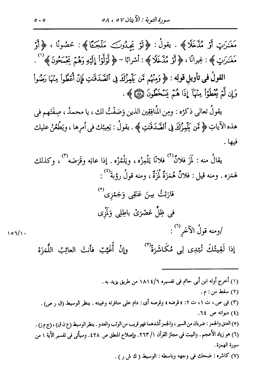 §الْقَوْلُ فِي تَأْوِيلِ قَوْلِهِ تَعَالَى: {وَمِنْهُمْ مَنْ يَلْمِزُكَ فِي الصَّدَقَاتِ فَإِنْ أُعْطُوا مِنْهَا رَضُوا وَإِنْ لَمْ يُعْطَوْا مِنْهَا إِذَا هُمْ يَسْخَطُونَ} [التوبة: 58] يَقُولُ تَعَالَى ذِكْرُهُ: وَمِنَ الْمُنَافِقِينَ الَّذِينَ وَصَفْتُ لَكَ يَا مُحَمَّدُ صِفَتَهُمْ فِي هَذِهِ الْآيَاتِ {مَنْ يَلْمِزُكَ فِي الصَّدَقَاتِ} [التوبة: 58] يَقُولُ: يَعِيبُكَ فِي أَمْرِهَا وَيَطْعَنُ عَلَيْكَ فِيهَا، يُقَالُ مِنْهُ: لَمَزَ فُلَانًا يَلْمِزُهُ، وَيَلْمُزُهُ: إِذَا عَابَهُ وَقَرَصَهُ، وَكَذَلِكَ هَمَزَهُ. وَمِنْهُ قِيلَ: فُلَانٌ هُمَزَةٌ لُمَزَةٌ، وَمِنْهُ قَوْلُ رُؤْبَةَ:
