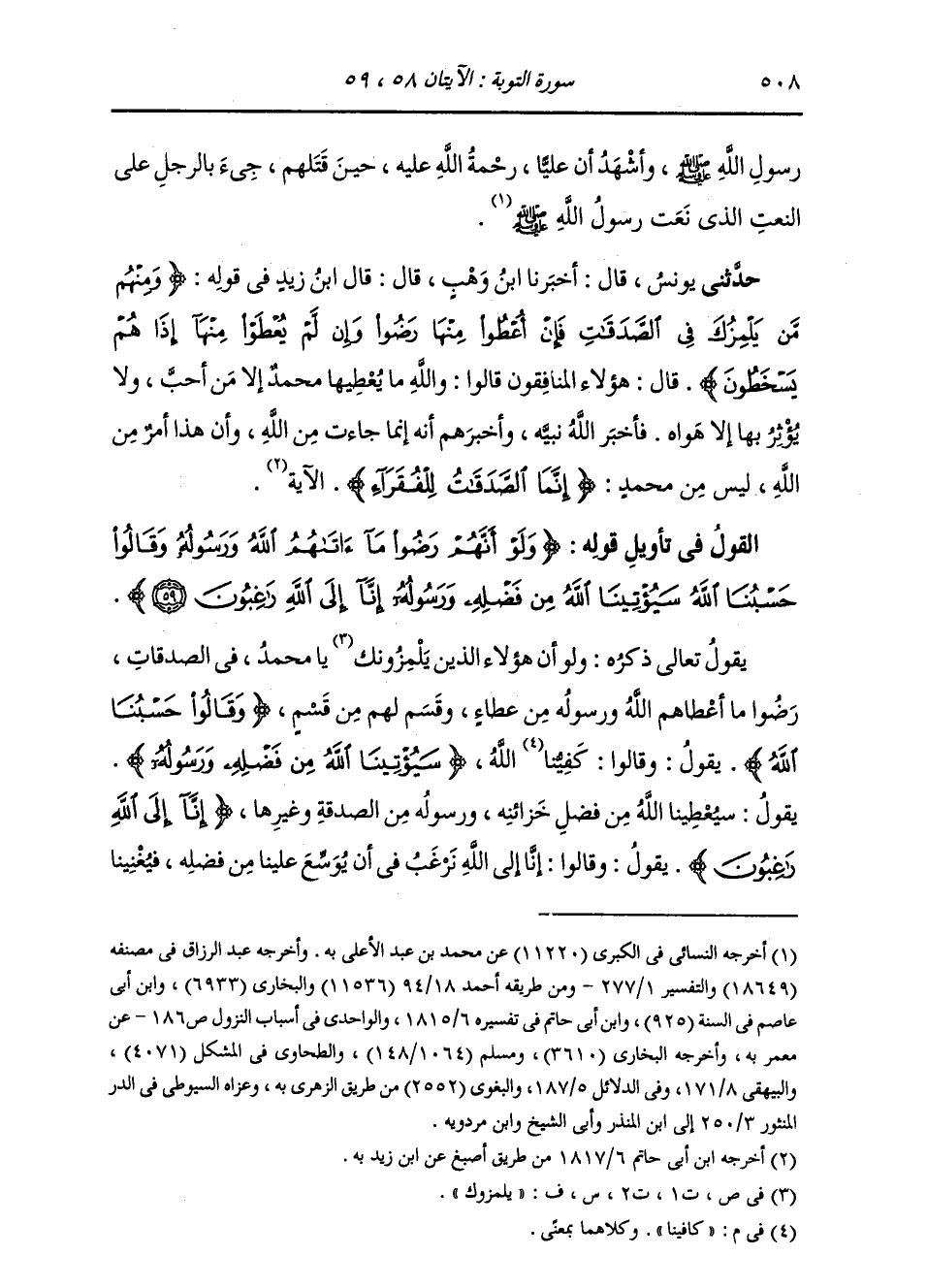 §الْقَوْلُ فِي تَأْوِيلِ قَوْلِهِ تَعَالَى: {وَلَوْ أَنَّهُمْ رَضُوا مَا آتَاهُمُ اللَّهُ وَرَسُولُهُ وَقَالُوا حَسْبُنَا اللَّهُ سَيُؤْتِينَا اللَّهُ مِنْ فَضْلِهِ وَرَسُولُهُ إِنَّا إِلَى اللَّهِ رَاغِبُونَ} [التوبة: 59] يَقُولُ تَعَالَى ذِكْرُهُ: وَلَوْ أَنَّ هَؤُلَاءَ الَّذِينَ يَلْمِزُونَكَ يَا مُحَمَّدُ فِي الصَّدَقَاتِ رَضُوا مَا أَعْطَاهُمُ اللَّهُ وَرَسُولُهُ مِنْ عَطَاءٍ وَقَسْمٍ لَهُمْ مَنْ قَسَمَ {وَقَالُوا حَسْبُنَا اللَّهُ} [آل عمران: 173] يَقُولُ: وَقَالُوا: كَافِينَا اللَّهُ {سَيُؤْتِينَا اللَّهُ مِنْ فَضْلِهِ وَرَسُولُهُ} [التوبة: 59] يَقُولُ: سَيُعْطِينَا اللَّهُ مِنْ فَضْلِ خَزَائِنِهِ وَرَسُولُهُ مِنَ الصَّدَقَةِ وَغَيْرِهَا {إِنَّا إِلَى اللَّهِ رَاغِبُونَ} [التوبة: 59] يَقُولُ: وَقَالُوا: إِنَّا إِلَى اللَّهِ نَرْغَبُ فِي أَنْ يُوَسِّعَ عَلَيْنَا مِنْ فَضْلِهِ، فَيُغْنِيَنَا -[509]- عَنِ الصَّدَقَةِ وَغَيْرِهَا مِنْ صِلَاتِ النَّاسِ وَالْحَاجَةِ إِلَيْهِمْ