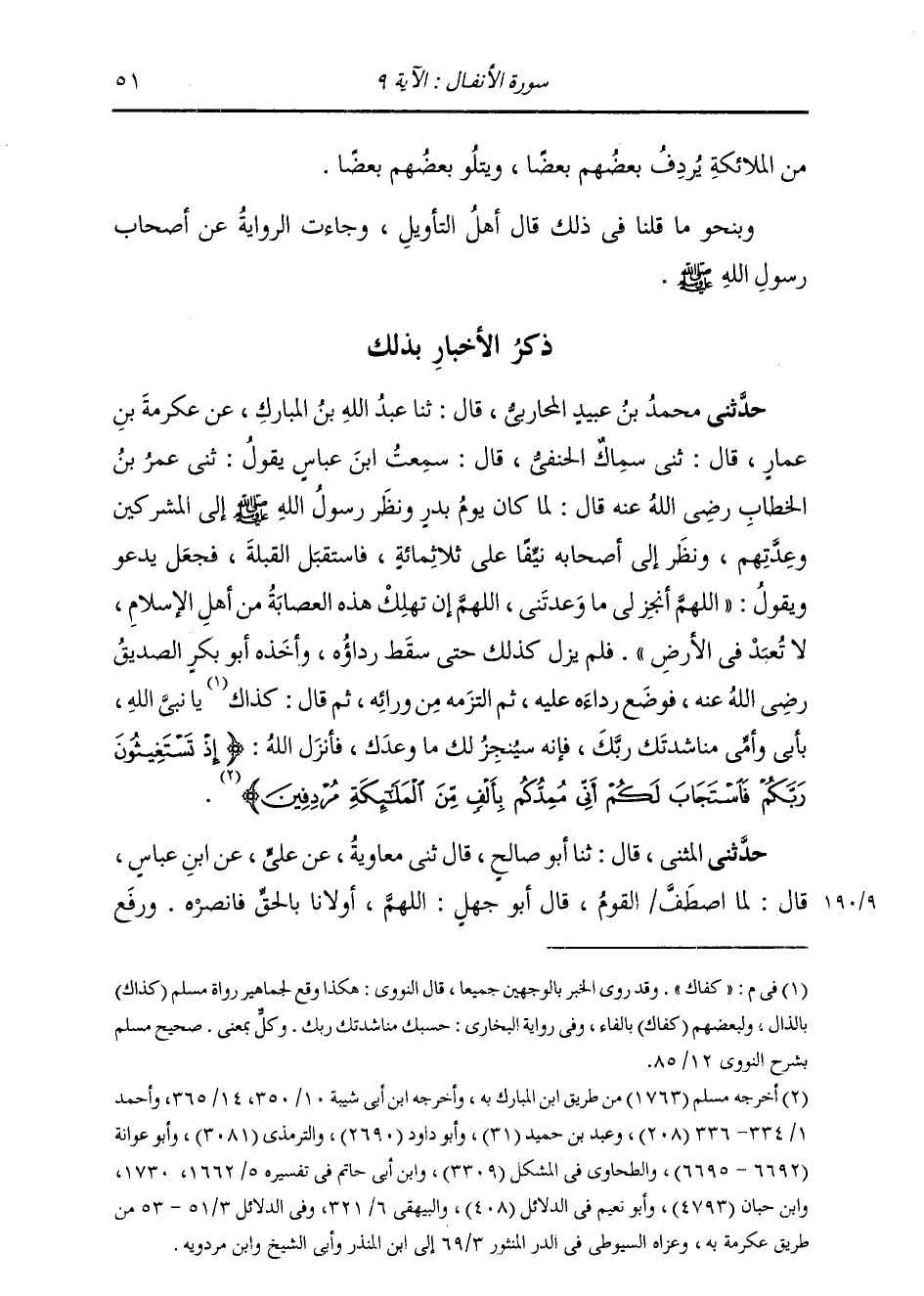 ذِكْرُ الْأَخْبَارِ بِذَلِكَ: حَدَّثَنِي مُحَمَّدُ بْنُ عُبَيْدٍ الْمُحَارِبِيُّ، قَالَ: ثنا عَبْدُ اللَّهِ بْنُ الْمُبَارَكِ، عَنْ عِكْرِمَةَ بْنِ عَمَّارٍ، قَالَ: ثني سِمَاكٌ الْحَنَفِيُّ قَالَ: سَمِعْتُ ابْنَ عَبَّاسٍ، يَقُولُ: ثني عُمَرُ بْنُ الْخَطَّابِ رَضِيَ اللَّهُ عَنْهُ قَالَ: " لَمَّا كَانَ يَوْمُ بَدْرٍ وَنَظَرَ رَسُولُ اللَّهِ صَلَّى اللهُ عَلَيْهِ وَسَلَّمَ إِلَى الْمُشْرِكِينَ وَعِدَّتِهِمْ، وَنَظَرَ إِلَى أَصْحَابِهِ نَيِّفًا عَلَى ثَلَاثِمِائَةٍ، فَاسْتَقْبَلَ الْقِبْلَةَ، فَجَعَلَ يَدْعُو وَيَقُولُ: «§اللَّهُمَّ أَنْجِزْ لِي مَا وَعَدْتَنِي، اللَّهُمَّ إِنْ تَهْلِكْ هَذِهِ الْعِصَابَةُ مِنْ أَهْلِ الْإِسْلَامِ، لَا تُعْبَدُ فِي الْأَرْضِ،» فَلَمْ يَزَلْ كَذَلِكَ حَتَّى سَقَطَ رِدَاؤُهُ، وَأَخَذَهُ أَبُو بَكْرٍ الصِّدِّيقُ رَضِيَ اللَّهُ عَنْهُ، فَوَضَعَ رِدَاءَهُ عَلَيْهِ، ثُمَّ الْتَزَمَهُ مِنْ وَرَائِهِ، ثُمَّ قَالَ: كَفَاكَ يَا نَبِيَّ اللَّهِ بِأَبِي وَأُمِّي مُنَاشَدَتُكَ رَبَّكَ، فَإِنَّهُ سَيُنْجِزُ لَكَ مَا وَعَدَكَ، فَأَنْزَلَ اللَّهُ: {إِذْ تَسْتَغِيثُونَ رَبَّكُمْ فَاسْتَجَابَ لَكُمْ أَنِّي مُمِدُّكُمْ بِأَلْفٍ مِنَ الْمَلَائِكَةِ مُرْدِفِينَ} [الأنفال: 9] "