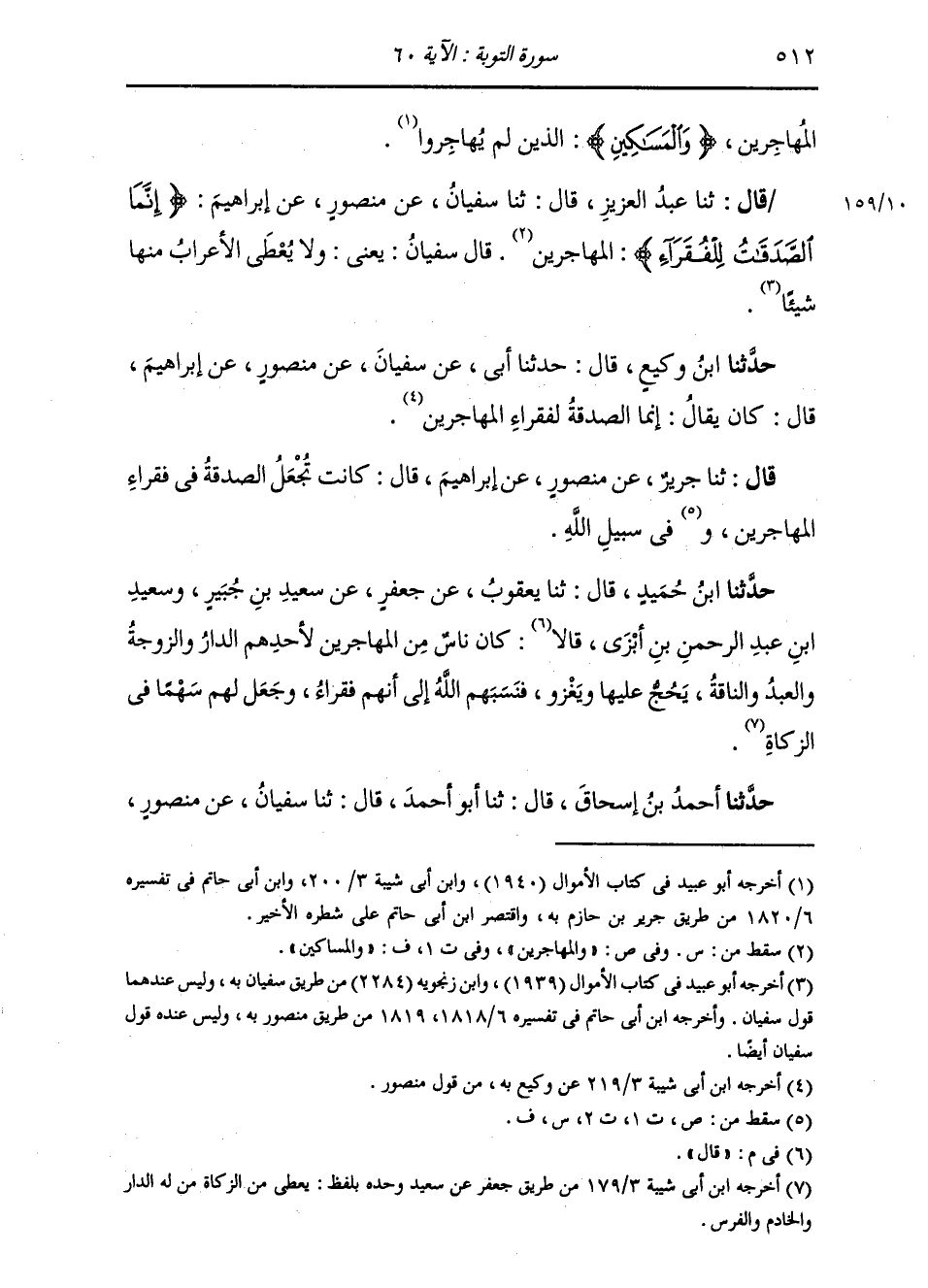 قَالَ: ثنا عَبْدُ الْعَزِيزِ، قَالَ: ثنا سُفْيَانُ، عَنْ مَنْصُورٍ، عَنْ إِبْرَاهِيمَ: " {§إِنَّمَا الصَّدَقَاتُ لِلْفُقَرَاءِ} [التوبة: 60] الْمُهَاجِرِينَ، قَالَ: سُفْيَانُ: يَعْنِي: وَلَا يُعْطِي الْأَعْرَابَ مِنْهَا شَيْئًا "
