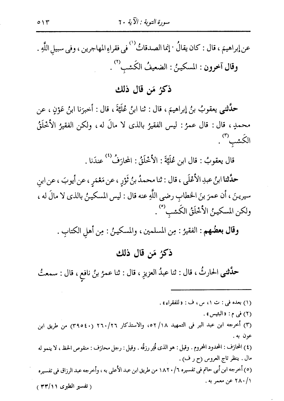 حَدَّثَنَا ابْنُ عَبْدِ الْأَعْلَى، قَالَ: ثنا مُحَمَّدُ بْنُ ثَوْرٍ، عَنْ مَعْمَرٍ، عَنْ أَيُّوبَ، عَنِ ابْنِ سِيرِينَ، أَنَّ عُمَرَ بْنَ الْخَطَّابِ، رَحِمَهُ اللَّهِ تَعَالَى قَالَ «§لَيْسَ الْمِسْكِينُ بِالَّذِي لَا مَالَ لَهُ وَلَكِنَّ الْمِسْكِينَ الْأَخْلَقُ الْكَسْبِ» وَقَالَ بَعْضُهُمُ: الْفَقِيرُ مِنَ الْمُسْلِمِينَ وَالْمِسْكِينُ أَهْلُ الْكِتَابِ