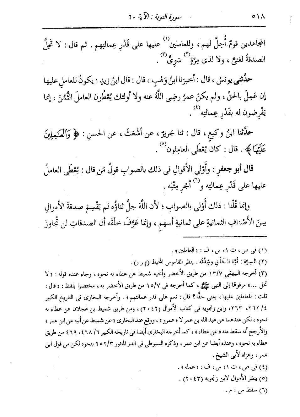 حَدَّثَنَا ابْنُ وَكِيعٍ، قَالَ: ثنا جَرِيرٌ، عَنْ أَشْعَثَ، عَنِ الْحَسَنِ: " {§وَالْعَامِلِينَ عَلَيْهَا} [التوبة: 60] قَالَ: كَانَ يُعْطَى الْعَامِلُونَ " قَالَ أَبُو جَعْفَرٍ: وَأَوْلَى الْأَقْوَالِ فِي ذَلِكَ بِالصَّوَابِ قَوْلُ مَنْ قَالَ: يُعْطَى الْعَامِلُ عَلَيْهَا عَلَى قَدْرِ عُمَالَتِهِ أَجْرَ مِثْلِهِ. وَإِنَّمَا قُلْنَا ذَلِكَ أَوْلَى بِالصَّوَابِ؛ لِأَنَّ اللَّهَ جَلَّ ثَنَاؤُهُ لَمْ يَقْسِمْ صَدَقَةَ الْأَمْوَالِ بَيْنَ الْأَصْنَافِ الثَّمَانِيَةِ عَلَى ثَمَانِيَةِ أَسْهُمٍ، وَإِنَّمَا عَرَّفَ خَلْقَهُ أَنَّ الصَّدَقَاتِ لَنْ تُجَاوِزَ