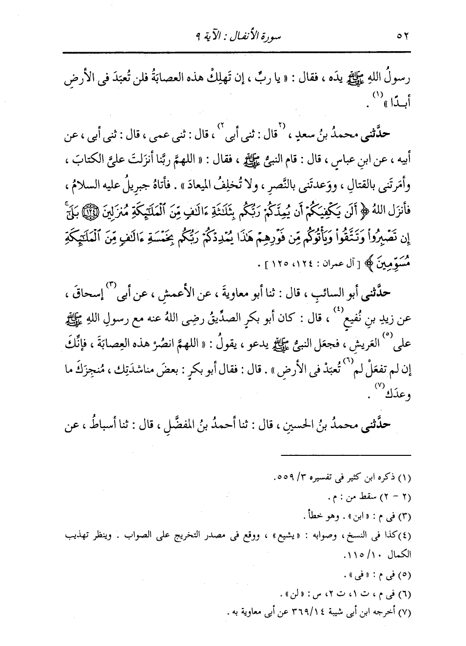 حَدَّثَنِي مُحَمَّدُ بْنُ الْحُسَيْنِ، قَالَ: ثنا أَحْمَدُ بْنُ الْمُفَضَّلِ، قَالَ: ثنا أَسْبَاطٌ، عَنِ -[53]- السُّدِّيِّ، قَالَ: «§أَقْبَلَ النَّبِيُّ صَلَّى اللهُ عَلَيْهِ وَسَلَّمَ يَدْعُو اللَّهَ وَيَسْتَغِيثُهُ وَيَسْتَنْصِرُهُ، فَأَنْزَلَ اللَّهُ عَلَيْهِ الْمَلَائِكَةَ»