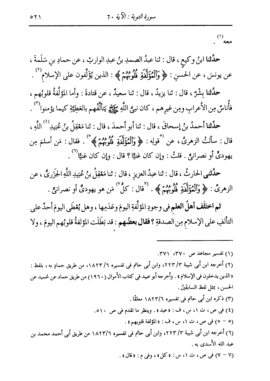 حَدَّثَنِي الْحَارِثُ، قَالَ: ثنا عَبْدُ الْعَزِيزِ، قَالَ: ثنا مَعْقِلُ بْنُ عُبَيْدِ اللَّهِ الْحَرَّانِيُّ، عَنِ الزُّهْرِيِّ: " {§وَالْمُؤَلَّفَةِ قُلُوبُهُمْ} [التوبة: 60] قَالَ: مَنْ هُوَ يَهُودِيُّ أَوْ نَصْرَانِيُّ " ثُمَّ اخْتَلَفَ أَهْلُ الْعِلْمِ فِي وُجُودِ الْمُؤَلَّفَةِ الْيَوْمَ وَعَدَمِهَا، وَهَلْ يُعْطَى الْيَوْمَ أُحُدٌ عَلَى التَّأَلُّفِ عَلَى الْإِسْلَامِ مِنَ الصَّدَقَةِ؟ فَقَالَ بَعْضُهُمْ: قَدْ بَطُلَتِ الْمُؤَلَّفَةُ قُلُوبُهُمُ الْيَوْمَ، وَلَا -[522]- سَهْمَ لِأَحَدٍ فِي الصَّدَقَةِ الْمَفْرُوضَةِ إِلَّا لِذِي حَاجَةٍ إِلَيْهَا وَفِي سَبِيلِ اللَّهِ أَوْ لِعَامِلٍ عَلَيْهَا