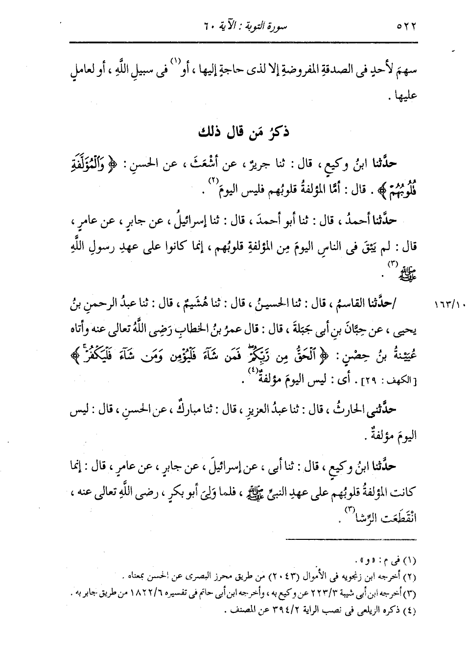 حَدَّثَنَا ابْنُ وَكِيعٍ، قَالَ: ثنا أَبِي، عَنْ إِسْرَائِيلَ، عَنْ جَابِرٍ، عَنْ عَامِرٍ، قَالَ: «§إِنَّمَا كَانَتِ الْمُؤَلَّفَةُ قُلُوبُهُمْ عَلَى عَهْدِ النَّبِيِّ صَلَّى اللهُ عَلَيْهِ وَسَلَّمَ، فَلَمَّا وُلِّيَ أَبُو بَكْرٍ رَحْمَةُ اللَّهِ تَعَالَى عَلَيْهِ انْقَطَعَتِ الرُّشَى» -[523]- وَقَالَ آخَرُونَ: الْمُؤَلَّفَةُ قُلُوبُهُمْ فِي كُلِّ زَمَانٍ، وَحَقُّهُمْ فِي الصَّدَقَاتِ