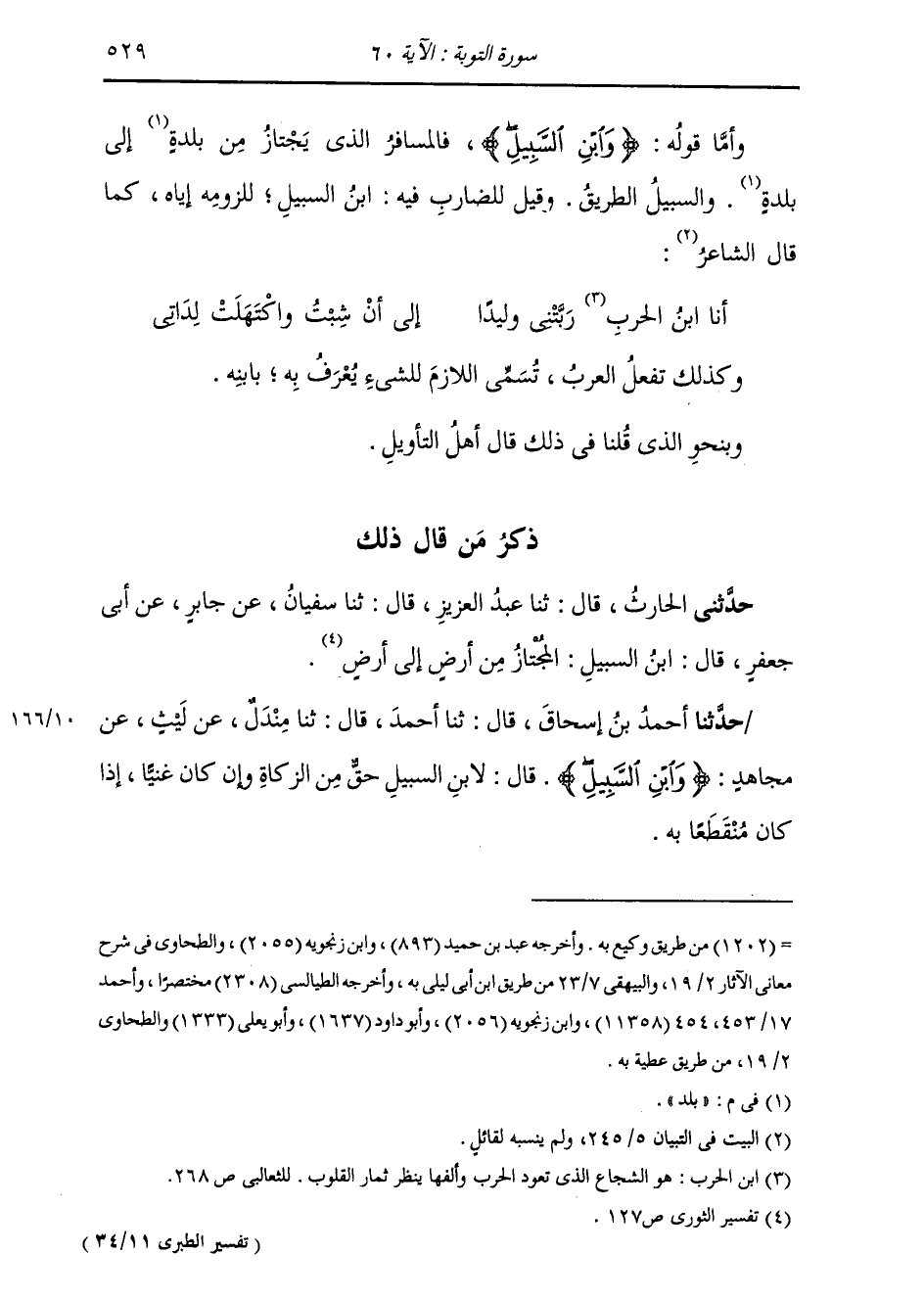 ذِكْرُ مَنْ قَالَ ذَلِكَ: حَدَّثَنِي الْحَارِثُ، قَالَ: ثنا عَبْدُ الْعَزِيزِ، قَالَ: ثنا سُفْيَانُ، عَنْ جَابِرٍ، عَنْ أَبِي جَعْفَرٍ، قَالَ: " §ابْنُ السَّبِيلِ: الْمُجْتَازُ مِنْ أَرْضٍ إِلَى أَرْضٍ "