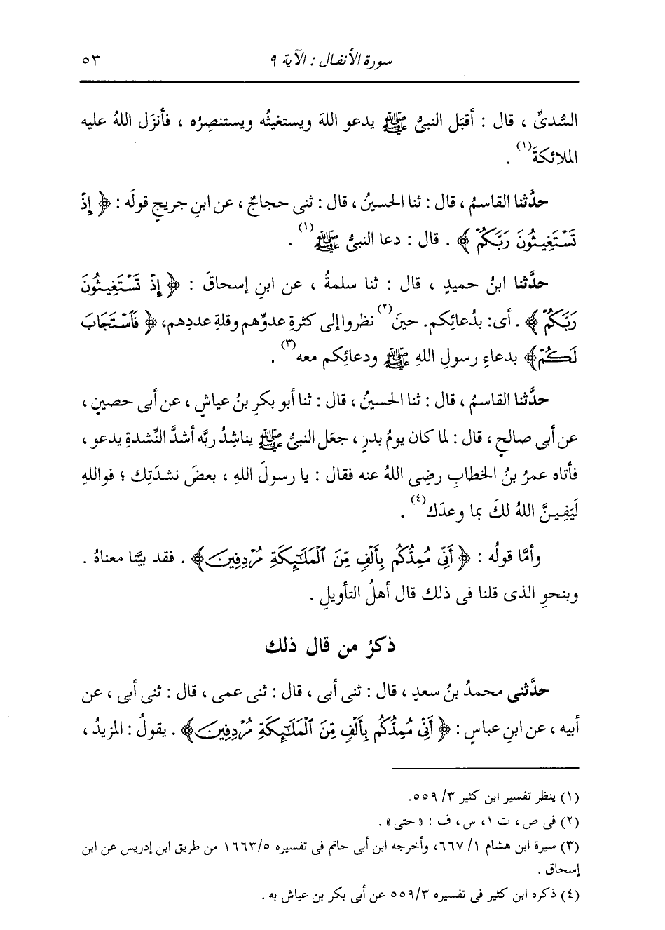 حَدَّثَنَا ابْنُ حُمَيْدٍ، قَالَ: ثنا سَلَمَةُ، عَنِ ابْنِ إِسْحَاقَ: " {§إِذْ تَسْتَغِيثُونَ رَبَّكُمْ} [الأنفال: 9] أَيْ: بِدُعَائِكُمْ حِينَ نَظَرُوا إِلَى كَثْرَةِ عَدُوِّهِمْ وَقِلَّةِ عَدَدِهِمْ، فَاسْتَجَابَ لَكُمْ بِدُعَاءِ رَسُولِ اللَّهِ صَلَّى اللهُ عَلَيْهِ وَسَلَّمَ وَدُعَائِكُمْ مَعَهُ "