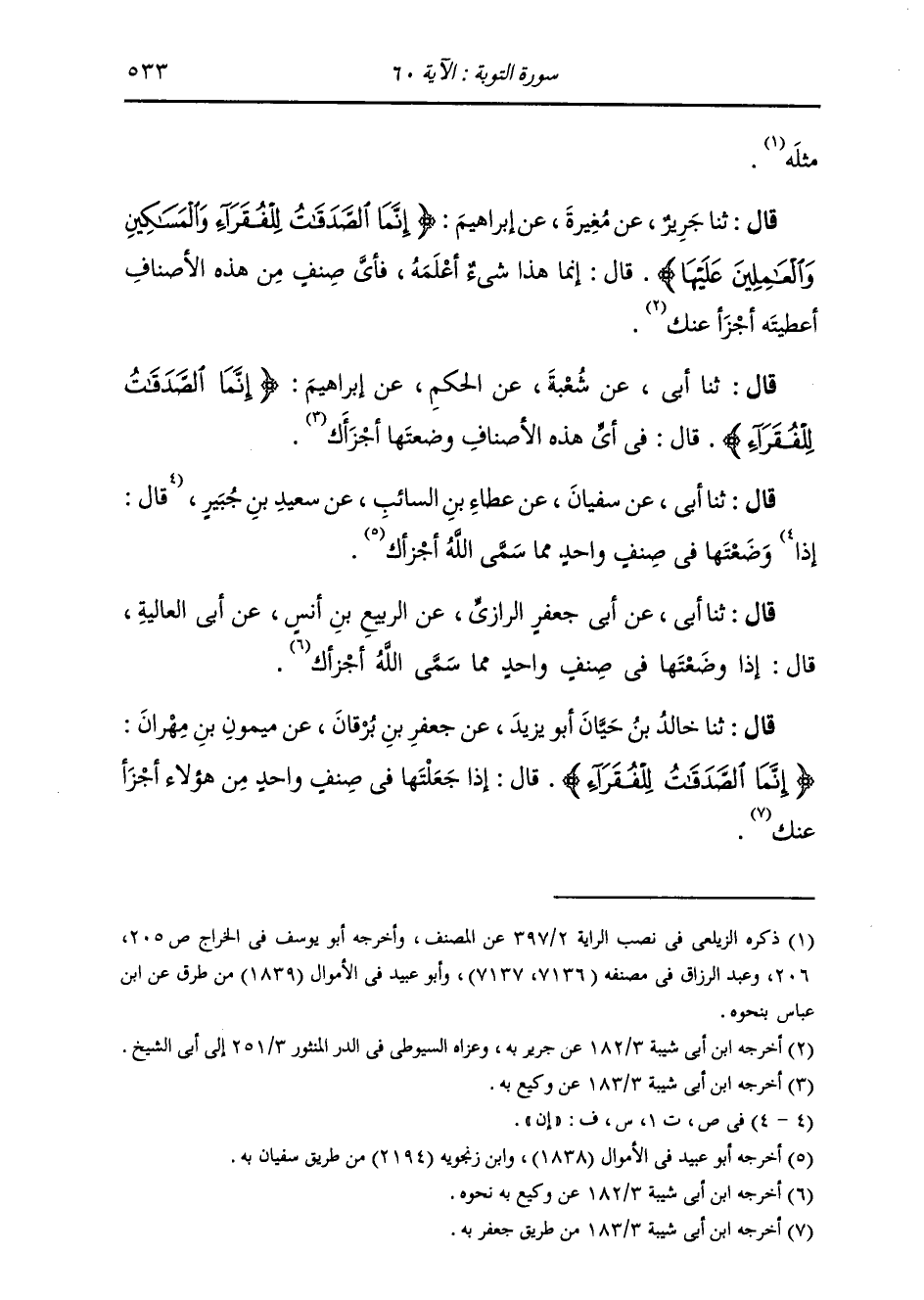 قَالَ: ثنا جَرِيرٌ، عَنْ مُغِيرَةَ، عَنْ إِبْرَاهِيمَ: " {§إِنَّمَا الصَّدَقَاتُ لِلْفُقَرَاءِ وَالْمَسَاكِينِ وَالْعَامِلِينَ عَلَيْهَا} [التوبة: 60] قَالَ: إِنَّمَا هَذَا شَيْءٌ أَعْلَمَهُ، فَأَيُّ صِنْفٍ مِنْ هَذِهِ الْأَصْنَافِ أَعْطَيْتَهُ أَجْزَأَ عَنْكَ "