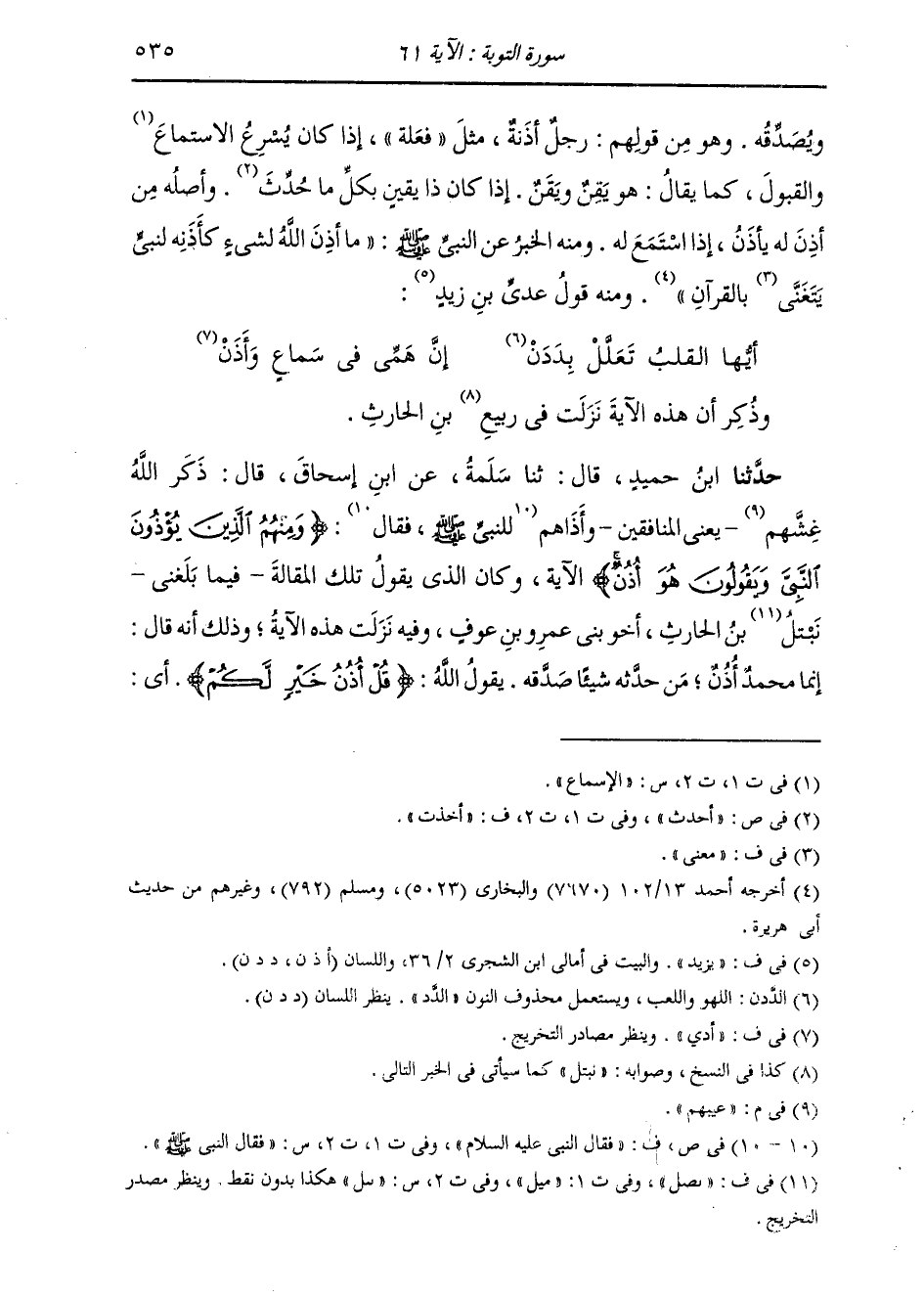 حَدَّثَنَا ابْنُ حُمَيْدٍ، قَالَ: ثنا سَلَمَةُ، عَنِ ابْنِ إِسْحَاقَ، قَالَ: " §ذَكَرَ اللَّهُ عَيْبَهُمْ، يَعْنِي الْمُنَافِقِينَ وَأَذَاهُمْ لِلنَّبِيِّ صَلَّى اللهُ عَلَيْهِ وَسَلَّمَ، فَقَالَ: {وَمِنْهُمُ الَّذِينَ يُؤْذُونَ النَّبِيَّ وَيَقُولُونَ هُوَ أُذُنٌ} [التوبة: 61] الْآيَةَ، وَكَانَ الَّذِي يَقُولُ تِلْكَ الْمَقَالَةَ فِيمَا بَلَغَنِي نَبْتَلُ بْنُ الْحَارِثِ أَخُو بَنِي عَمْرِو بْنِ عَوْفٍ، وَفِيهِ نَزَلَتْ هَذِهِ الْآيَةُ، وَذَلِكَ أَنَّهُ قَالَ: إِنَّمَا مُحَمَّدٌ أُذُنٌ، مَنْ حَدَّثَهُ شَيْئًا صَدَّقَهُ، يَقُولُ اللَّهُ: {قُلْ أُذُنُ خَيْرٍ لَكُمْ} [التوبة: 61] أَيْ