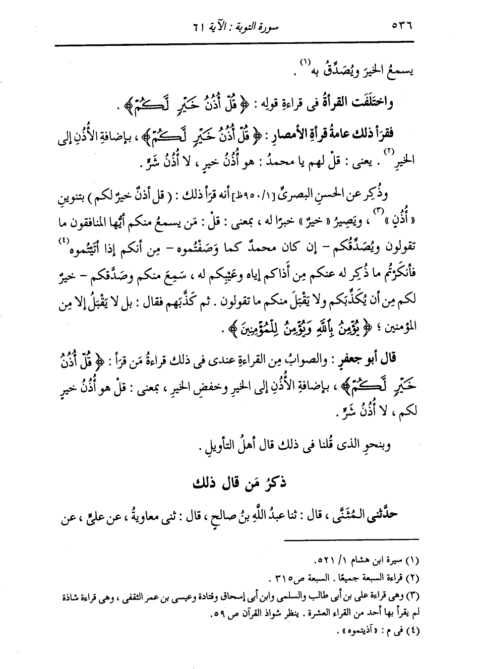 ذِكْرُ مَنْ قَالَ ذَلِكَ: حَدَّثَنِي الْمُثَنَّى، قَالَ: ثني عَبْدُ اللَّهِ بْنُ صَالِحٍ، قَالَ: ثني مُعَاوِيَةُ، عَنْ عَلِيٍّ، عَنِ -[537]- ابْنِ عَبَّاسٍ، قَوْلُهُ: " {§وَمِنْهُمُ الَّذِينَ يُؤْذُونَ النَّبِيَّ وَيَقُولُونَ هُوَ أُذُنٌ} [التوبة: 61] يَسْمَعُ مِنْ كُلِّ أَحَدٍ "