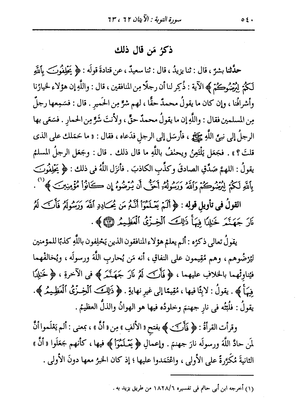 §الْقَوْلُ فِي تَأْوِيلِ قَوْلِهِ تَعَالَى: {أَلَمْ يَعْلَمُوا أَنَّهُ مَنْ يُحَادِدِ اللَّهَ وَرَسُولَهُ فَأَنَّ لَهُ نَارَ جَهَنَّمَ خَالِدًا فِيهَا ذَلِكَ الْخِزْيُ الْعَظِيمُ} [التوبة: 63] يَقُولُ تَعَالَى ذِكْرُهُ: أَلَمْ يَعْلَمْ هَؤُلَاءِ الْمُنَافِقُونَ الَّذِينَ يَحْلِفُونَ بِاللَّهِ كَذِبًا لِلْمُؤْمِنِينَ لِيُرْضُوهُمْ وَهُمْ مُقِيمُونَ عَلَى النِّفَاقِ، أَنَّهُ مِنْ يُحَارِبُ اللَّهَ وَرَسُولَهُ وَيُخَالِفُهَمَا فَيُنَاوِئُهُمَا بِالْخِلَافِ عَلَيْهِمَا {فَأَنَّ لَهُ نَارَ جَهَنَّمَ} [التوبة: 63] فِي الْآخِرَةِ. {خَالِدًا فِيهَا} [النساء: 14] يَقُولُ: لَابِثًا فِيهَا، مُقِيمًا إِلَى غَيْرِ نِهَايَةٍ. {ذَلِكَ الْخِزْي الْعَظِيمُ} [التوبة: 63] يَقُولُ: فَلِبِثُهُ فِي نَارِ جَهَنَّمَ وَخُلُودُهُ فِيهَا هُوَ الْهَوَانُ وَالذُّلُّ الْعَظِيمُ، وَقَرَأَتِ الْقُرَّاءُ: {فَأَنَّ} [الأنفال: 41] بِفَتْحِ الْأَلْفِ مِنْ أَنَّ بِمَعْنَى: أَلَمْ يَعْلَمُوا أَنَّ لِمَنْ حَادَّ اللَّهَ وَرَسُولَهُ نَارَ جَهَنَّمَ، وَإِعْمَالِ يَعْلَمُوا فِيهَا، كَأَنَّهُمْ جَعَلُوا أَنَّ الثَّانِيَةَ مُكَرَّرَةً عَلَى الْأُولَى، وَاعْتَمَدُوا عَلَيْهَا؛ إِذْ كَانَ الْخَبَرُ مَعَهَا دُونَ الْأُولَى.