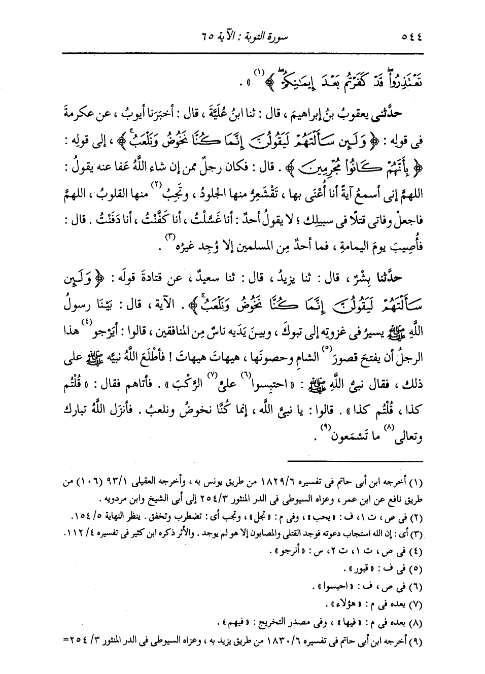 حَدَّثَنِي يَعْقُوبُ بْنُ إِبْرَاهِيمَ، قَالَ: ثنا ابْنُ عُلَيَّةَ، قَالَ: أَخْبَرَنَا أَيُّوبُ، عَنْ عِكْرِمَةَ، فِي قَوْلِهِ: " {§وَلَئِنْ سَأَلْتَهُمْ لَيَقُولُنَّ إِنَّمَا كُنَّا نَخُوضُ وَنَلْعَبُ} [التوبة: 65] إِلَى قَوْلِهِ: {بِأَنَّهُمْ كَانُوا مُجْرِمِينَ} [التوبة: 66] قَالَ: فَكَانَ رَجُلٌ مِمَّنْ إِنْ شَاءَ اللَّهُ عَفَا عَنْهُ يَقُولُ: اللَّهُمَّ إِنِّي أَسْمَعُ آيَةً أَنَا أُعْنَى بِهَا، تَقْشَعِرُّ مِنْهَا الْجُلُودُ، وَتَجِلُ مِنْهَا الْقُلُوبُ، اللَّهُمَّ فَاجْعَلْ وَفَاتِي قَتْلًا فِي سَبِيلِكَ، لَا يَقُولُ أَحَدٌ: أَنَا غُسَّلْتُ، أَنَا كَفَّنْتُ، أَنَا دَفَنْتُ، قَالَ: فَأُصِيبَ يَوْمَ الْيَمَامَةِ، فَمَا مِنْ أَحَدٍ مِنَ الْمُسْلِمِينَ إِلَّا وُجِدَ غَيْرَهُ "