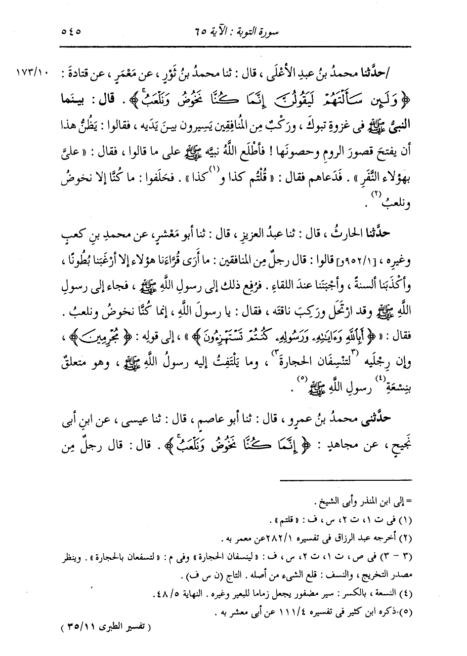 حَدَّثَنَا مُحَمَّدُ بْنُ عَبْدِ الْأَعْلَى، قَالَ: ثنا مُحَمَّدُ بْنُ ثَوْرٍ، عَنْ مَعْمَرٍ، عَنْ قَتَادَةَ: {§وَلَئِنْ سَأَلْتَهُمْ لَيَقُولُنَّ إِنَّمَا كُنَّا نَخُوضُ وَنَلْعَبُ} [التوبة: 65] قَالَ: بَيْنَمَا النَّبِيُّ صَلَّى اللهُ عَلَيْهِ وَسَلَّمَ فِي غَزْوَةِ تَبُوكَ وَرَكْبٌ مِنَ الْمُنَافِقِينَ يَسِيرُونَ بَيْنَ يَدَيْهِ، فَقَالُوا: يَظُنُّ هَذَا أَنْ يَفْتَحَ قُصُورَ الرُّومِ وَحُصُونَهَا، فَأَطْلَعَ اللَّهُ نَبِيَّهُ صَلَّى اللهُ عَلَيْهِ وَسَلَّمَ عَلَى مَا قَالُوا، فَقَالَ: «عَلَيَّ بِهَؤُلَاءِ النَّفَرِ» فَدَعَاهُمْ فَقَالَ: «قُلْتُمْ كَذَا وَكَذَا؟» فَحَلَفُوا: مَا كُنَّا إِلَّا نَخُوضُ وَنَلْعَبُ