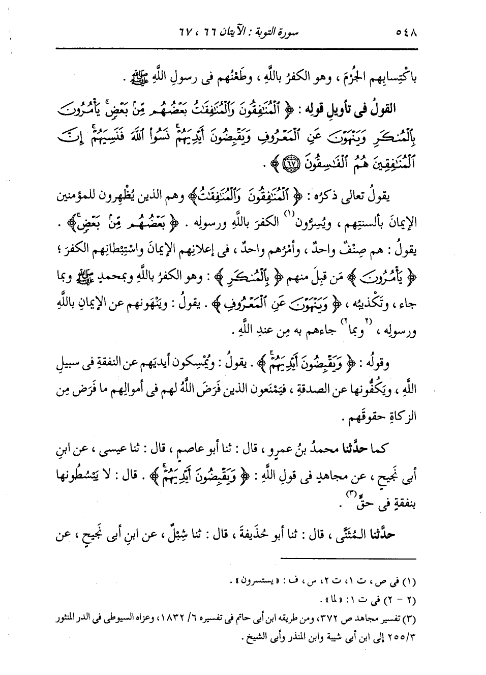 كَمَا: حَدَّثَنَا مُحَمَّدُ بْنُ عَمْرٍو، قَالَ: ثنا أَبُو عَاصِمٍ، قَالَ: ثنا عِيسَى، عَنِ ابْنِ أَبِي نَجِيحٍ، عَنْ مُجَاهِدٍ، فِي قَوْلِهِ: " {§وَيَقْبِضُونَ أَيْدِيَهُمْ} [التوبة: 67] قَالَ: لَا يُبْسِطُونَهَا بِنَفَقَةٍ فِي حَقٍّ ". حَدَّثَنَا الْمُثَنَّى، قَالَ: ثنا أَبُو حُذَيْفَةَ، قَالَ: ثنا شِبْلٌ، عَنِ ابْنِ أَبِي نَجِيحٍ، عَنْ -[549]- مُجَاهِدٍ مِثْلَهُ. حَدَّثَنِي الْمُثَنَّى، قَالَ: ثنا إِسْحَاقُ، قَالَ: ثنا عَبْدُ اللَّهِ، عَنْ وَرْقَاءَ، عَنِ ابْنِ أَبِي نَجِيحٍ، عَنْ مُجَاهِدٍ مِثْلَهُ. حَدَّثَنَا الْقَاسِمُ، قَالَ: ثنا الْحُسَيْنُ، قَالَ: ثني حَجَّاجٌ، عَنِ ابْنِ جُرَيْجٍ، عَنْ مُجَاهِدٍ، نَحْوَهُ