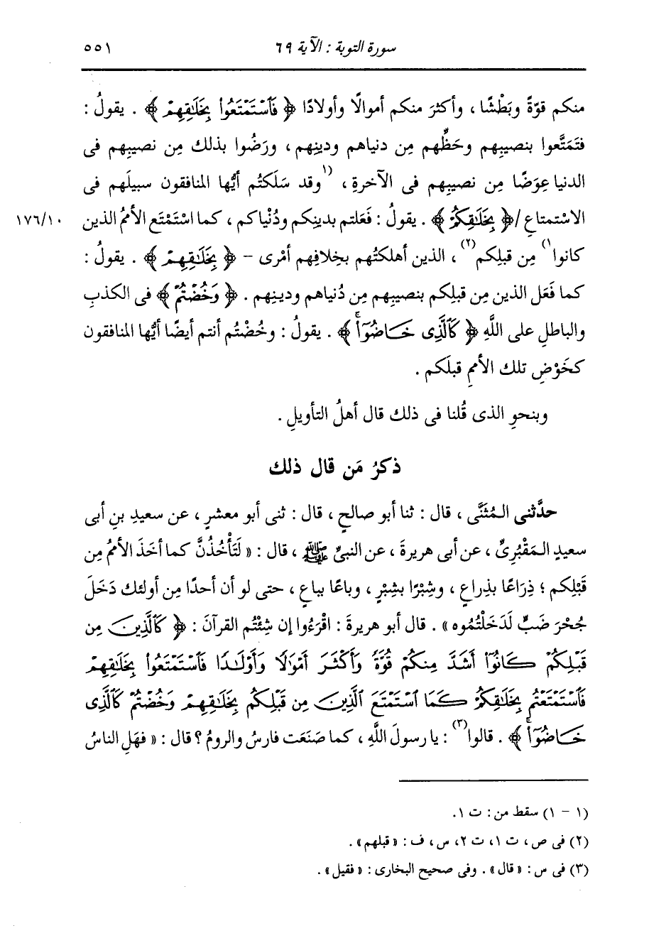 ذِكْرُ مَنْ قَالَ ذَلِكَ: حَدَّثَنِي الْمُثَنَّى، قَالَ: ثنا أَبُو صَالِحٍ، قَالَ: ثني أَبُو مَعْشَرٍ، عَنْ سَعِيدِ بْنِ أَبِي سَعِيدٍ الْمَقْبُرِيِّ، عَنْ أَبِي هُرَيْرَةَ، عَنِ النَّبِيِّ صَلَّى اللهُ عَلَيْهِ وَسَلَّمَ، قَالَ: «§لَتَأْخُذُنَّ كَمَا أَخَذَ الْأُمَمُ مِنْ قَبْلِكُمْ، ذِرَاعًا بِذِرَاعٍ، وَشِبْرًا بِشِبْرٍ، وَبَاعًا بِبَاعٍ، حَتَّى لَوْ أَنَّ أَحَدًا مِنْ أُولَئِكَ دَخَلَ جُحْرَ ضَبٍّ لَدَخَلْتُمُوهُ» . قَالَ أَبُو هُرَيْرَةَ: اقْرَءُوا إِنْ شِئْتُمُ الْقُرْآنَ: {كَالَّذِينَ مِنْ قَبْلِكُمْ كَانُوا أَشَدَّ مِنْكُمْ قُوَّةً وَأَكْثَرَ أَمْوَالًا وَأَوْلَادًا فَاسْتَمْتَعُوا بِخَلَاقِهِمْ فَاسْتَمْتَعْتُمْ بِخَلَاقِكُمْ كَمَا اسْتَمْتَعَ الَّذِينَ مِنْ قَبْلِكُمْ بِخَلَاقِهِمْ وَخُضْتُمْ كَالَّذِي خَاضُوا} [التوبة: 69] قَالُوا: يَا رَسُولَ اللَّهِ، كَمَا صَنَعَتْ فَارِسُ وَالرُّومُ؟ قَالَ: «فَهَلِ النَّاسُ -[552]- إِلَّا هُمْ»