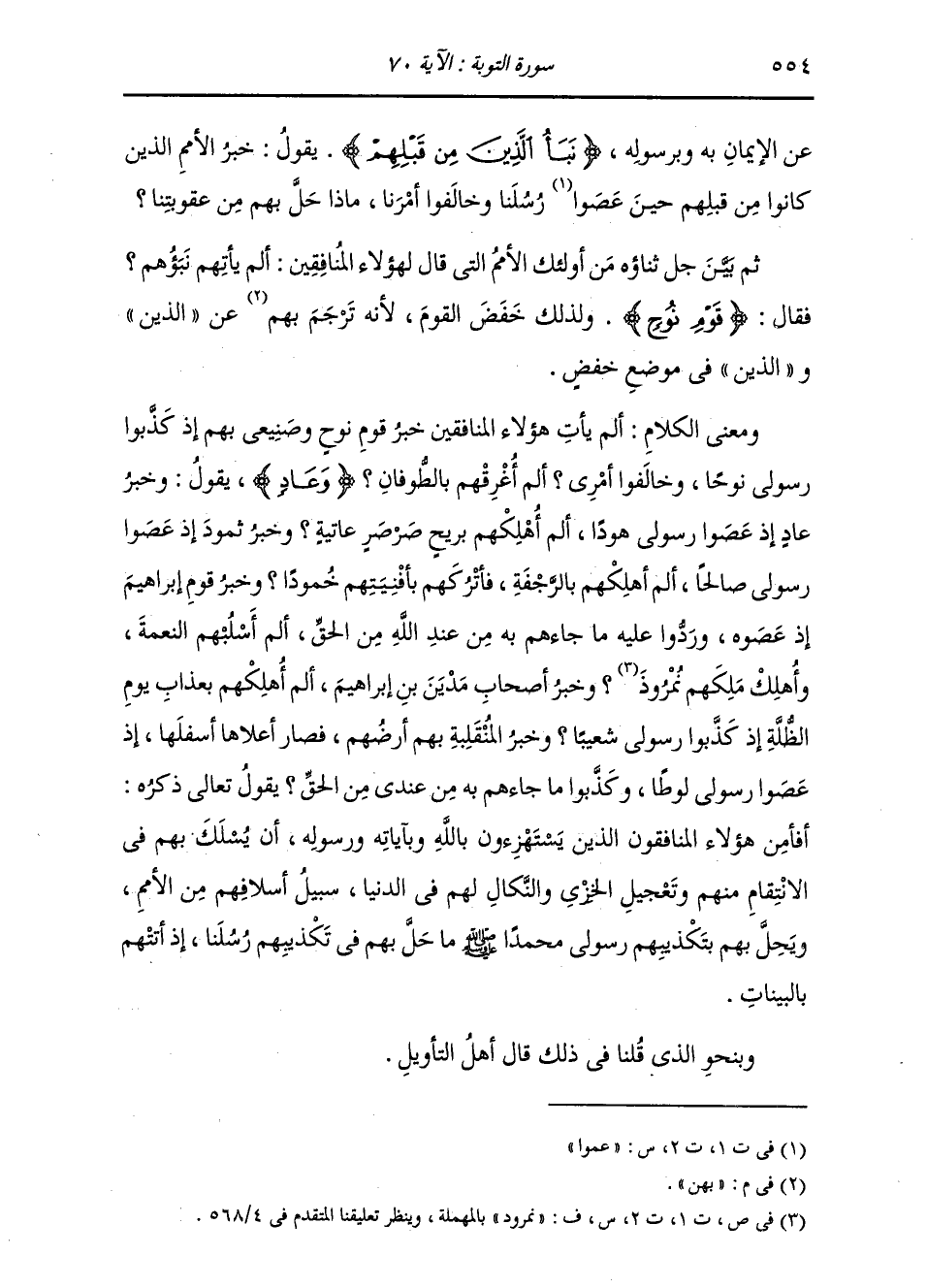 عَنِ الْإِيمَانِ بِهِ وَبِرَسُولِهِ {نَبَأُ الَّذِينَ مِنْ قَبْلِهُمْ} [التوبة: 70] يَقُولُ: خَبَرُ الْأُمَمِ الَّذِينَ كَانُوا مِنْ قَبْلِهُمْ حِينَ عَصَوْا رُسُلَنَا، وَخَالَفُوا أَمْرَنَا مَاذَا حَلَّ بِهِمْ مِنْ عُقُوبَتِنَا؟ ثُمَّ بَيَّنَ جَلَّ ثَنَاؤُهُ مَنْ أُولَئِكَ الْأُمَمُ الَّتِي قَالَ لِهَؤُلَاءِ الْمُنَافِقِينَ أَلَمْ يَأْتِهِمْ نَبَؤُهُمْ، فَقَالَ: {قَوْمِ نُوحٍ} [الأعراف: 69] وَلِذَلِكَ خَفَضَ الْقَوْمَ لِأَنَّهُ تَرْجَمَ بِهِنَّ عَنِ الَّذِينَ، وَالَّذِينَ فِي مَوْضِعِ خَفْضٍ. وَمَعْنَى الْكَلَامِ: أَلَمْ يَأْتِ هَؤُلَاءِ الْمُنَافِقِينَ خَبَرُ قَوْمِ نُوحٍ وَصَنِيعِي بِهِمْ؛ إِذْ كَذَّبُوا رَسُولِي نُوحًا وَخَالَفُوا أَمْرِي، أَلَمْ أُغْرِقْهُمْ بِالطُّوفَانِ؟ {وَعَادٍ} [التوبة: 70] يَقُولُ: وَخَبَرُ عَادٍ إِذْ عَصَوْا رَسُولِي هُودًا، أَلَمْ أُهْلِكْهُمْ بِرِيحٍ صَرْصَرٍ عَاتِيَةٍ؟ وَخَبَرُ ثَمُودَ إِذْ عَصَوْا رَسُولِي صَالِحًا، أَلَمْ أُهْلِكْهُمْ بِالرَّجْفَةِ، فَأَتْرُكْهُمْ بِأَفْنِيَتِهِمْ خُمُودًا؟ وَخَبَرُ قَوْمِ إِبْرَاهِيمَ إِذْ عَصَوْهُ، وَرَدُّوا عَلَيْهِ مَا جَاءَهُمْ بِهِ مِنْ عِنْدِ اللَّهِ مِنَ الْحَقِّ، أَلَمْ أَسْلُبْهُمُ النِّعْمَةَ وَأُهْلِكْ مَلِكَهُمْ نُمْرُوذَ؟ وَخَبَرُ أَصْحَابِ مَدْيَنَ بْنِ إِبْرَاهِيمَ، أَلَمْ أُهْلِكْهُمْ بِعَذَابِ يَوْمِ الظُّلَّةِ؛ إِذْ كَذَّبُوا رَسُولِي شُعَيْبًا؟ وَخَبَرُ الْمُنْقَلِبَةِ بِهِمْ أَرْضُهُمْ، فَصَارَ أَعْلَاهَا أَسْفَلَهَا؛ إِذْ عَصَوْا رَسُولِي لُوطًا وَكَذَّبُوا مَا جَاءَهُمْ بِهِ مِنْ عِنْدِي مِنَ الْحَقِّ. يَقُولُ تَعَالَى ذِكْرُهُ: أَفَأَمِنَ هَؤُلَاءِ الْمُنَافِقُونَ الَّذِينَ يَسْتَهْزِئُونَ بِاللَّهِ وَبِآيَاتِهِ وَرَسُولِهِ، أَنْ يُسْلَكَ بِهِمْ فِي الِانْتِقَامِ مِنْهُمْ وَتَعْجِيلِ الْخِزْيِ وَالنَّكَالِ لَهُمْ فِي الدُّنْيَا سَبِيلُ أَسْلَافِهِمْ مِنَ الْأُمَمِ، وَيَحِلَّ بِهِمْ بِتَكْذِيبِهِمْ رَسُولِي مُحَمَّدًا صَلَّى اللهُ عَلَيْهِ وَسَلَّمَ مَا حَلَّ بِهِمْ فِي تَكْذِيبِهِمْ رُسُلَنَا؛ إِذْ أَتَتْهُمْ بِالْبَيِّنَاتِ. وَبِنَحْوِ الَّذِي قُلْنَا فِي ذَلِكَ قَالَ أَهْلُ التَّأْوِيلِ