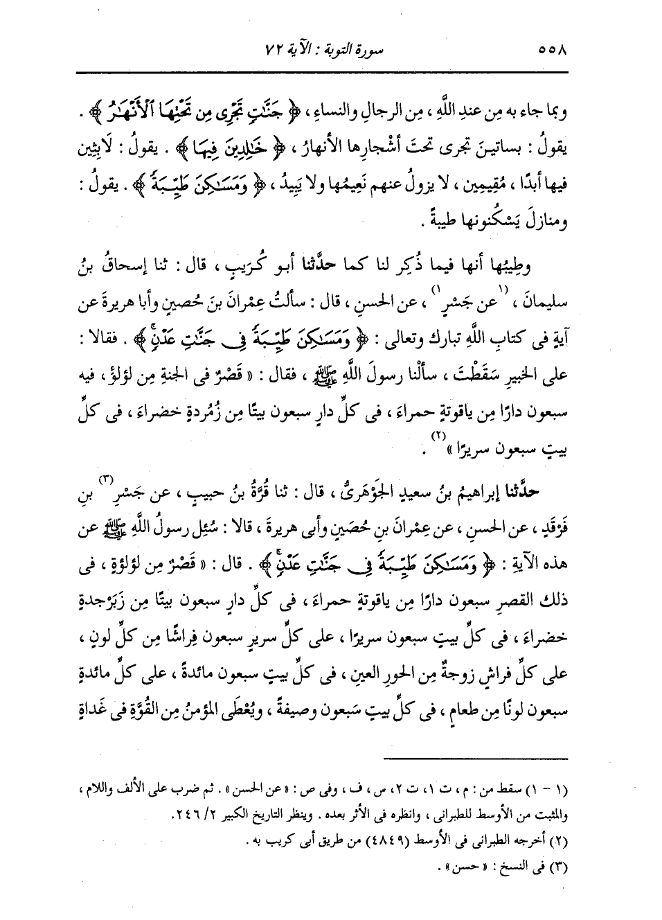 كَمَا: حَدَّثَنَا أَبُو كُرَيْبٍ، قَالَ: ثنا إِسْحَاقُ بْنُ سُلَيْمَانَ، عَنِ الْحَسَنِ، قَالَ: سَأَلْتُ عِمْرَانَ بْنَ حُصَيْنٍ وَأَبَا هُرَيْرَةَ عَنْ آيَةٍ، فِي كِتَابِ اللَّهِ تَبَارَكَ وَتَعَالَى: {§وَمَسَاكِنَ طَيِّبَةً فِي جَنَّاتِ عَدْنٍ} [التوبة: 72] فَقَالَا: عَلَى الْخَبِيرِ سَقَطْتَ، سَأَلْنَا رَسُولَ اللَّهِ صَلَّى اللهُ عَلَيْهِ وَسَلَّمَ، فَقَالَ: «قَصْرٌ فِي الْجَنَّةِ مِنْ لُؤْلُؤٍ، فِيهِ سَبْعُونَ دَارًا مِنْ يَاقُوتَةٍ حَمْرَاءَ، فِي كُلِّ دَارٍ سَبْعُونَ بَيْتًا مِنْ زُمُرُّدَةٍ خَضْرَاءَ، فِي كُلِّ بَيْتٍ سَبْعُونَ سَرِيرًا»