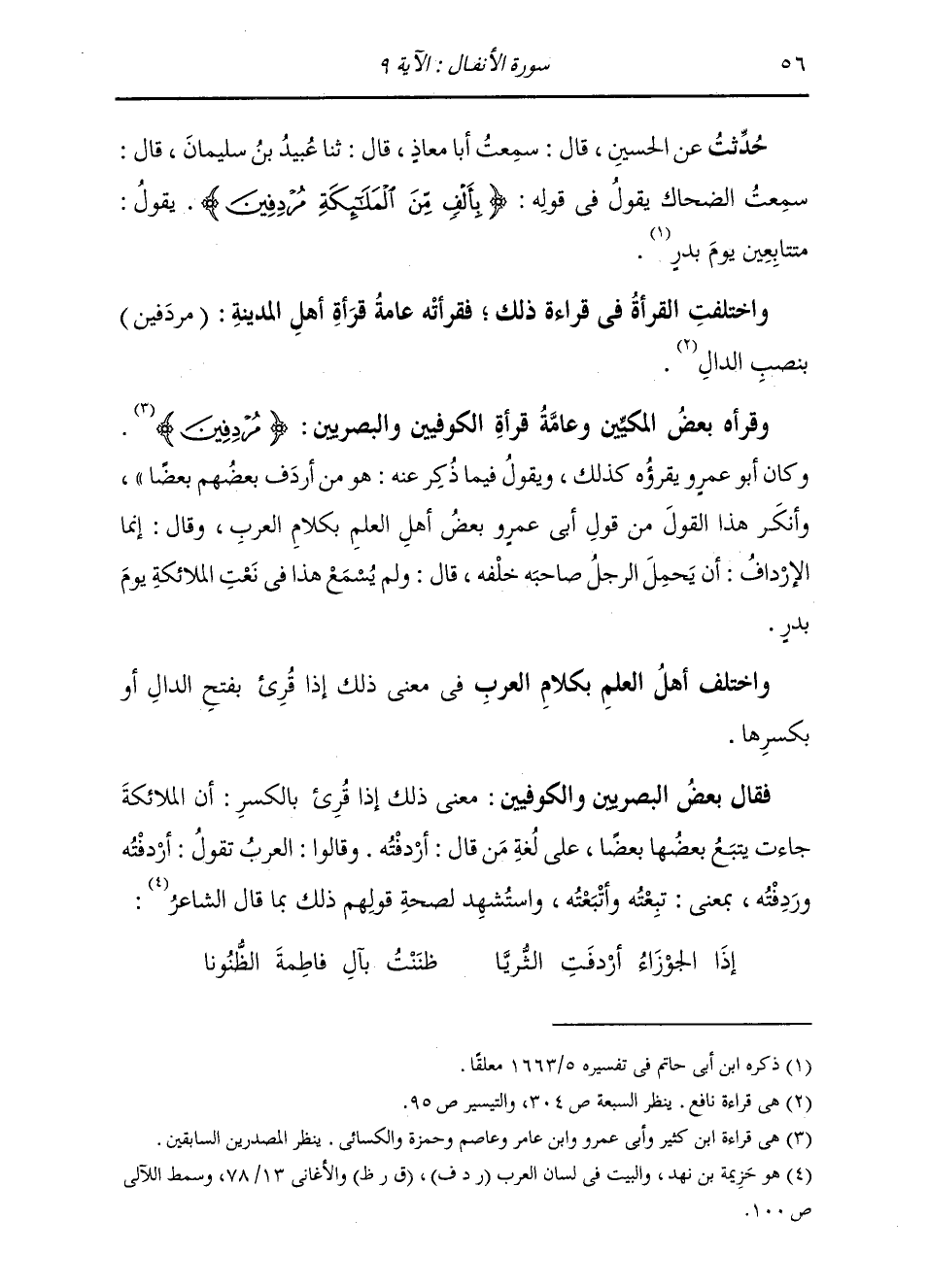 حُدِّثْتُ عَنِ الْحُسَيْنِ، قَالَ: سَمِعْتُ أَبَا مُعَاذٍ، قَالَ: ثنا عُبَيْدُ بْنُ سُلَيْمَانَ، قَالَ: سَمِعْتُ الضَّحَّاكَ، يَقُولُ فِي قَوْلِهِ: " {§بِأَلْفٍ مِنَ الْمَلَائِكَةِ مُرْدِفِينَ} [الأنفال: 9] يَقُولُ: مُتَتَابِعِينَ يَوْمَ بَدْرٍ " وَاخْتَلَفَتِ الْقُرَّاءُ فِي قِرَاءَةِ ذَلِكَ، فَقَرَأَتْهُ عَامَّةُ قُرَّاءِ أَهْلِ الْمَدِينَةِ (مُرْدَفِينَ) بِنَصْبِ الدَّالِ. وَقَرَأَهُ بَعْضُ الْمَكِّيِّينَ وَعَامَّةُ قُرَّاءِ الْكُوفِيِّينَ وَالْبَصْرِيِّينَ: {مُرْدِفِينَ} [الأنفال: 9] وَكَانَ أَبُو عَمْرٍو يَقْرَؤُهُ كَذَلِكَ، وَيَقُولُ فِيمَا ذُكِرَ عَنْهُ: هُوَ مِنْ أَرْدَفَ بَعْضُهُمْ بَعْضًا. وَأَنْكَرَ هَذَا الْقَوْلَ مِنْ قَوْلِ أَبِي عَمْرٍو بَعْضُ أَهْلِ الْعِلْمِ بِكَلَامِ الْعَرَبِ، وَقَالَ: إِنَّمَا الْإِرْدَافُ: أَنْ يَحْمِلَ الرَّجُلُ صَاحِبَهُ خَلْفَهُ قَالَ: وَلَمْ يُسْمَعْ هَذَا فِي نَعْتِ الْمَلَائِكَةِ يَوْمَ بَدْرٍ. وَاخْتَلَفَ أَهْلُ الْعِلْمِ بِكَلَامِ الْعَرَبِ فِي مَعْنَى ذَلِكَ إِذَا قُرِئَ بِفَتْحِ الدَّالِ أَوْ بِكَسْرِهَا، فَقَالَ بَعْضُ الْبَصْرِيِّينَ وَالْكُوفِيِّينَ: مَعْنَى ذَلِكَ إِذَا قُرِئَ بِالْكَسْرِ أَنَّ الْمَلَائِكَةَ جَاءَتْ يَتْبَعُ بَعْضُهُمْ بَعْضًا عَلَى لُغَةِ مَنْ قَالَ: أَرْدَفْتُهُ، وَقَالُوا: الْعَرَبُ تَقُولُ: أَرْدَفْتُهُ وَرَدِفْتُهُ، بِمَعْنَى: تَبِعْتُهُ وَأَتْبَعْتُهُ. وَاسْتُشْهِدَ لِصِحَّةِ قَوْلِهِمْ ذَلِكَ بِمَا قَالَ الشَّاعِرُ: