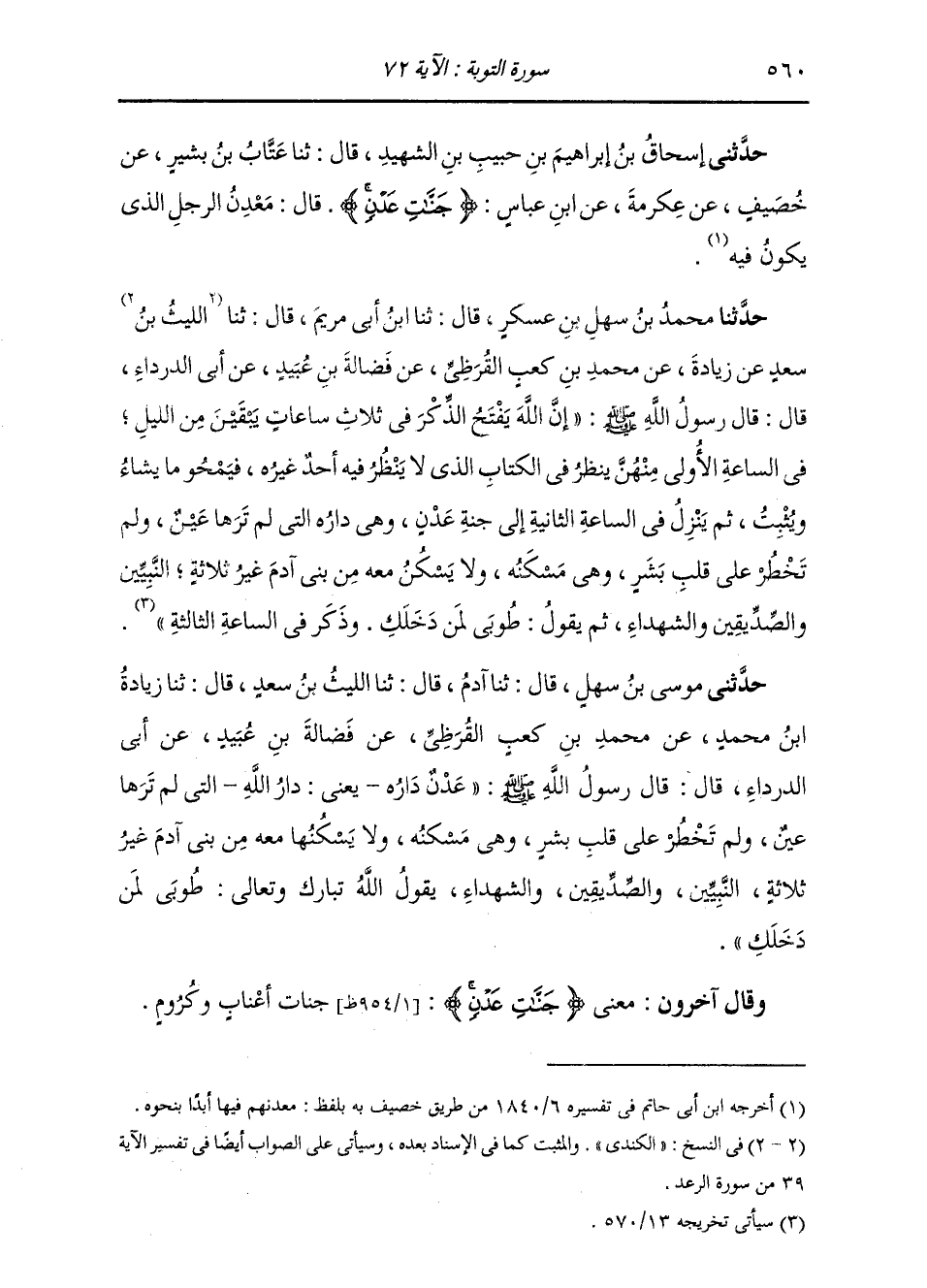 حَدَّثَنِي مُوسَى بْنُ سَهْلٍ، قَالَ: ثنا آدَمُ، قَالَ: ثنا اللَّيْثُ بْنُ سَعْدٍ، قَالَ: ثنا زِيَادَةُ بْنُ مُحَمَّدٍ، عَنْ مُحَمَّدِ بْنِ كَعْبٍ الْقُرَظِيِّ، عَنْ فَضَالَةَ بْنِ عُبَيْدٍ، عَنْ أَبِي الدَّرْدَاءِ، قَالَ: قَالَ رَسُولُ اللَّهِ صَلَّى اللهُ عَلَيْهِ وَسَلَّمَ: «§عَدْنٌ دَارُهُ» يَعْنِي دَارَ اللَّهِ " الَّتِي لَمْ تَرَهَا عَيْنٌ وَلَمْ تَخْطُرْ عَلَى قَلْبِ بَشَرٍ، وَهِيَ مَسْكَنُهُ، وَلَا يَسْكُنُهَا مَعَهُ مِنْ بَنِي آدَمَ غَيْرُ ثَلَاثٍ: النَّبِيِّينَ، وَالصِّدِّيقِينَ، وَالشُّهَدَاءِ، يَقُولُ اللَّهُ تَبَارَكَ وَتَعَالَى: طُوبَى لِمَنْ دَخَلَكِ " وَقَالَ آخَرُونَ: مَعْنَى {جَنَّاتِ عَدْنٍ} [التوبة: 72] جَنَّاتِ أَعْنَابٍ وَكُرُومٍ