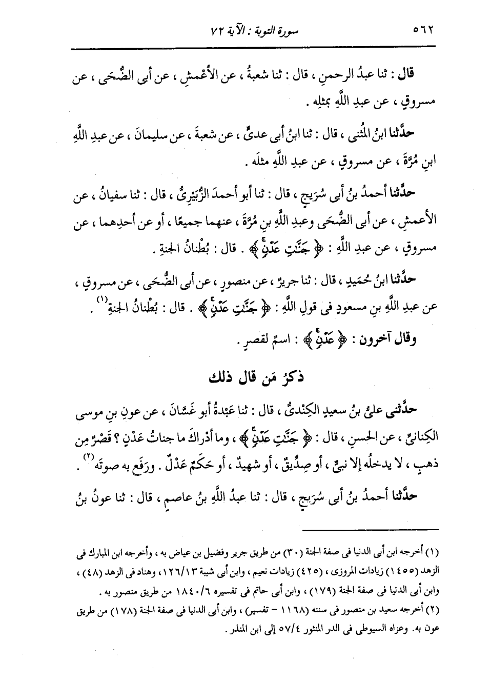 حَدَّثَنَا أَحْمَدُ بْنُ أَبِي سُرَيْجٍ، قَالَ: ثنا أَبُو أَحْمَدَ الزُّبَيْرِيُّ، قَالَ: ثنا سُفْيَانُ، عَنِ الْأَعْمَشِ، عَنْ أَبِي الضُّحَى وَعَبْدِ اللَّهِ بْنِ مُرَّةَ عَنْهُمَا جَمِيعًا، أَوْ عَنْ أَحَدِهِمَا، عَنْ مَسْرُوقٍ، عَنْ عَبْدِ اللَّهِ: " {§جَنَّاتِ عَدْنٍ} [التوبة: 72] قَالَ: بُطْنَانُ الْجَنَّةِ "